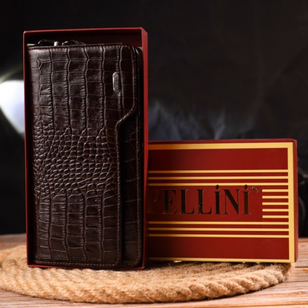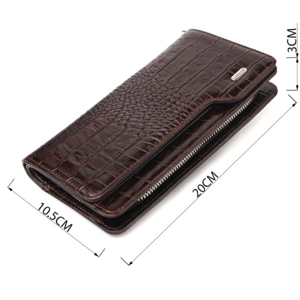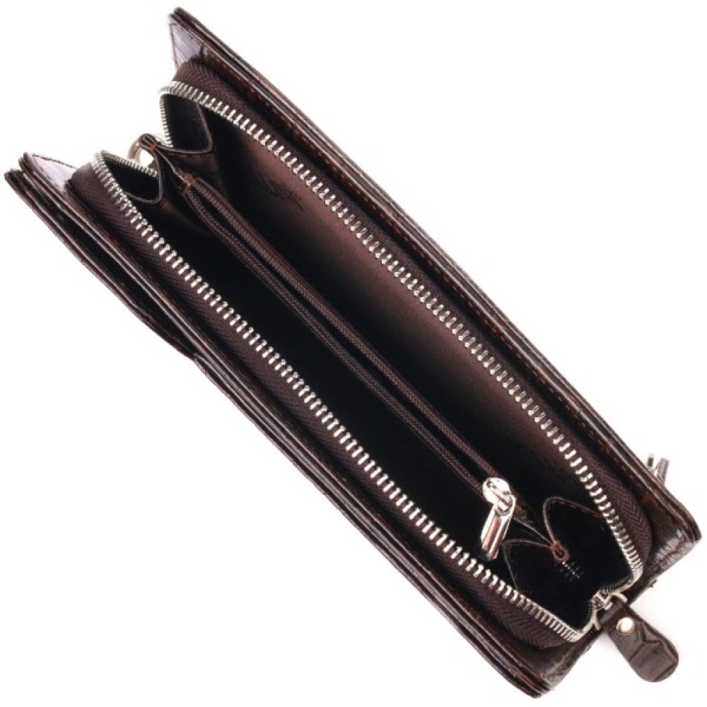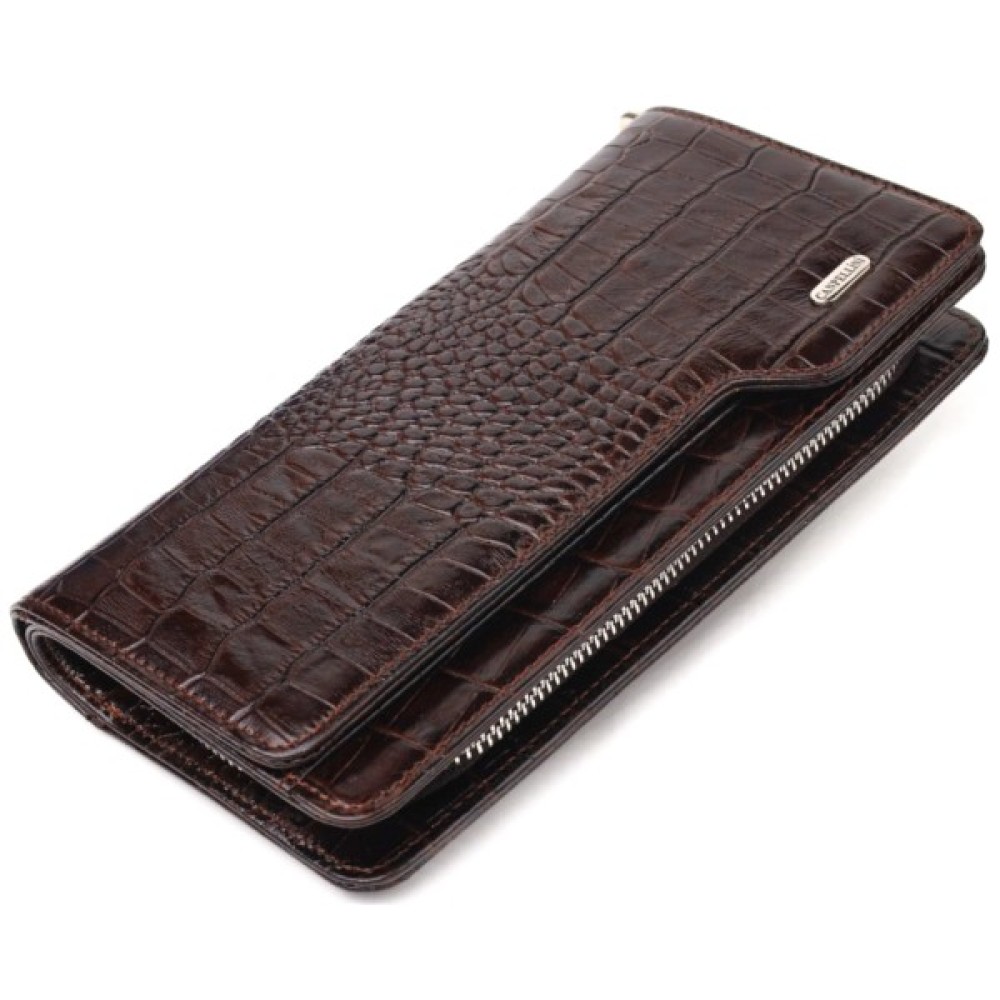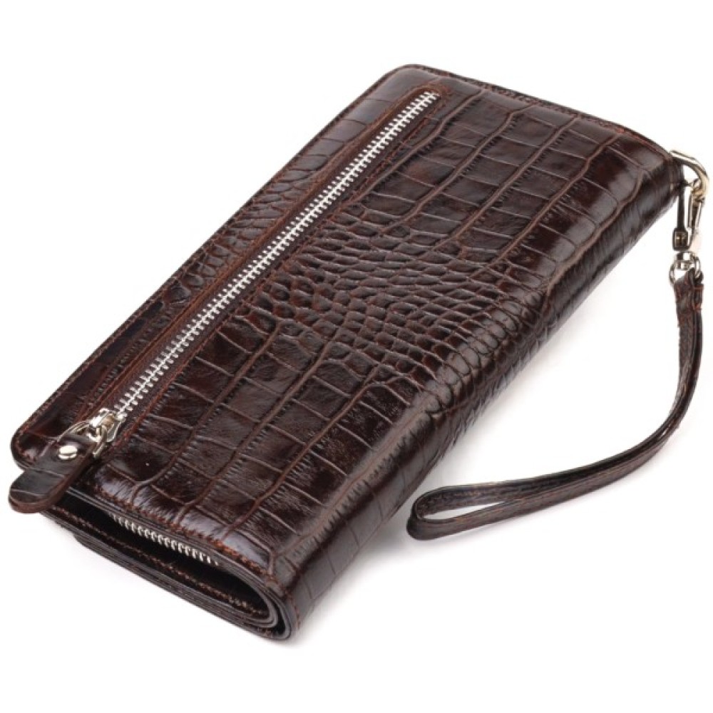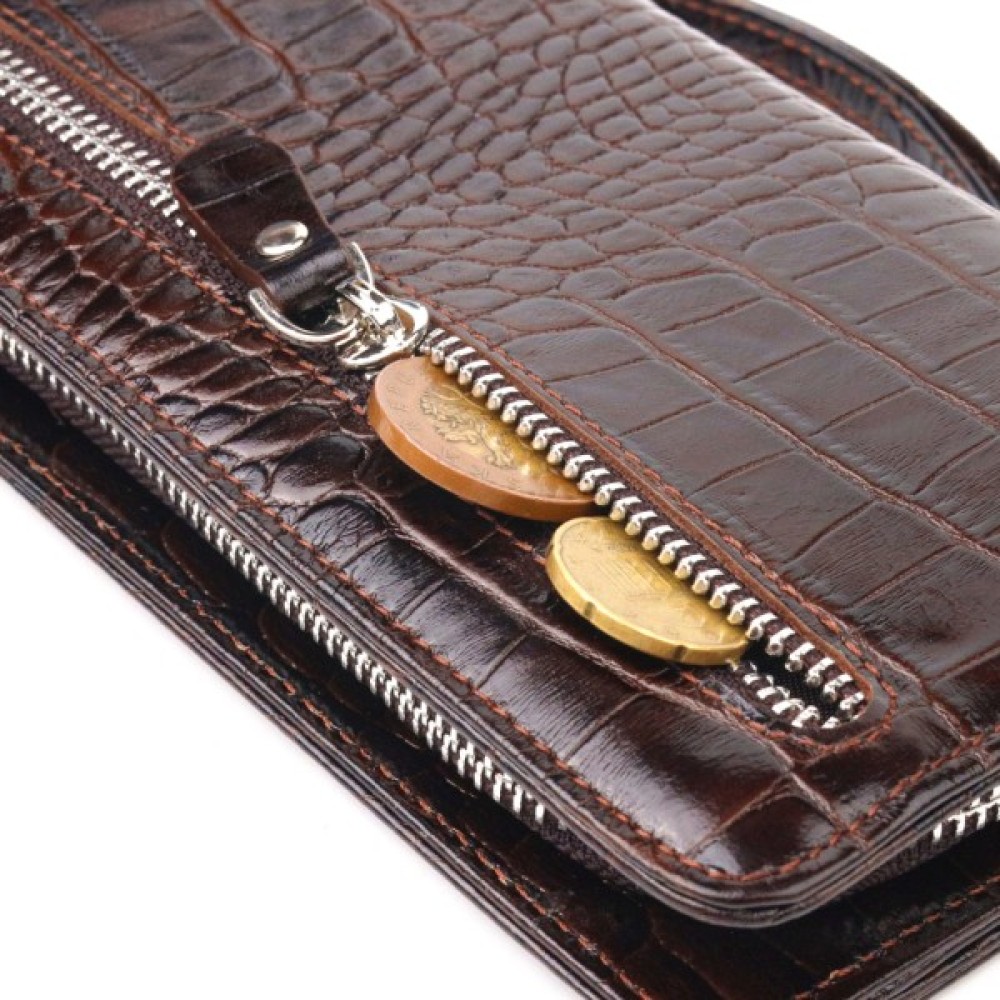 Стильний гаманець-клатч з натуральної фактурної шкіри з тисненням під крокодила. Аксесуар має одне просторе відділення для купюр, дванадцять кишень для карток (одна з них — під сіточкою), дві кишеньки на блискавці, знімний кистьовий ремінь та блок для карток із зовнішнього боку, що закривається на кнопки. Основне відділення закривається на блискавку. Колір фурнітури – срібло. Шкіряний аксесуар стане чудовим подарунком на будь-який випадок.