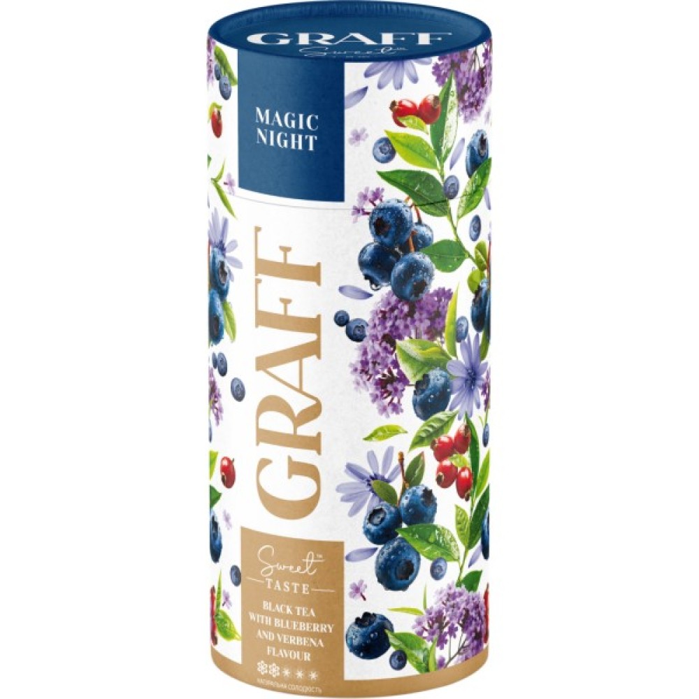 Чай Graff Магічна ніч — це чорний листовий чай з витонченим ароматом чорниці та вербени, який створює неповторну атмосферу затишку та спокою. Унікальна комбінація смаків дарує насичений і приємний післясмак, а натуральні інгредієнти надають тонкий фруктово-квітковий відтінок. Завдяки зручній упаковці вагою 80 г чай зберігає свіжість та аромат тривалий час. Ідеально підходить для вечірніх чаювань, релаксу після насиченого дня або як подарунок для поціновувачів високоякісного чорного чаю.