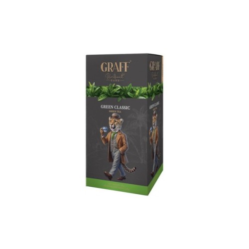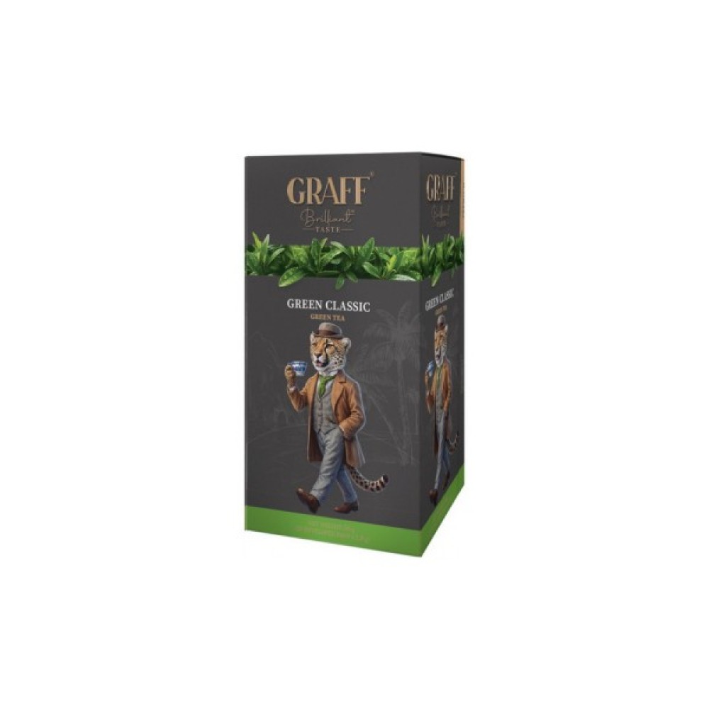 Чай Graff Green Classic – це високоякісний зелений чай у зручних пакетиках по 1,8 г, упакований у коробку по 20 штук. Завдяки ретельному відбору чайного листя, він має ніжний, свіжий аромат і легкий освіжаючий смак, що дарує енергію та бадьорість у будь-який час дня. Кожен пакетик індивідуально загорнутий, що зберігає свіжість та насиченість смаку напою. Чай Graff Green Classic легко заварюється, швидко розкриваючи свої натуральні властивості, і стане відмінним вибором для щоденного вживання як вдома, так і в офісі.