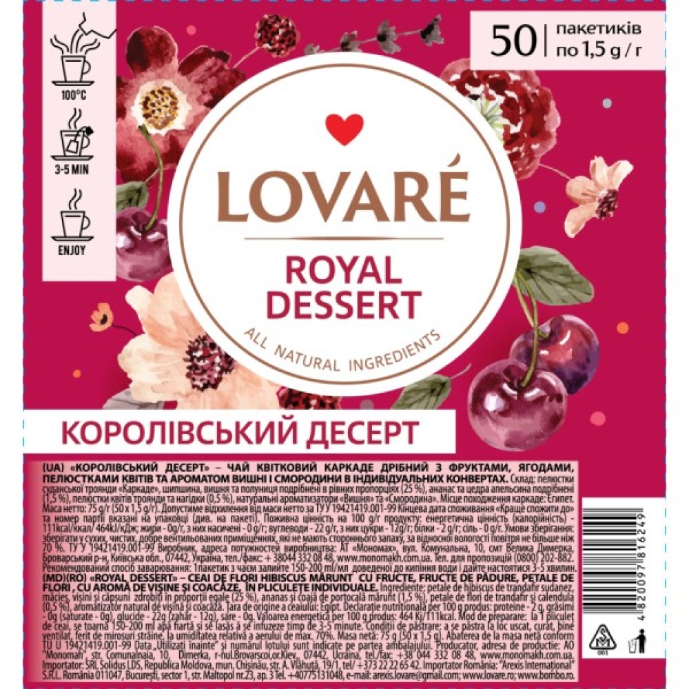 Чудова чайна суміш Королівський десерт від Lovare — подрібнені пелюстки суданської троянди «каркаде», шматочки фруктів, цедра апельсина, пелюстки китайської троянди та календули. Натуральні ароматизатори вишні та смородини.