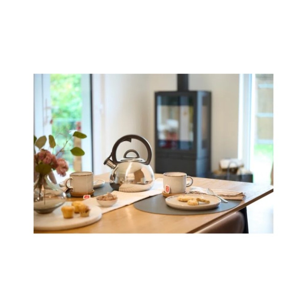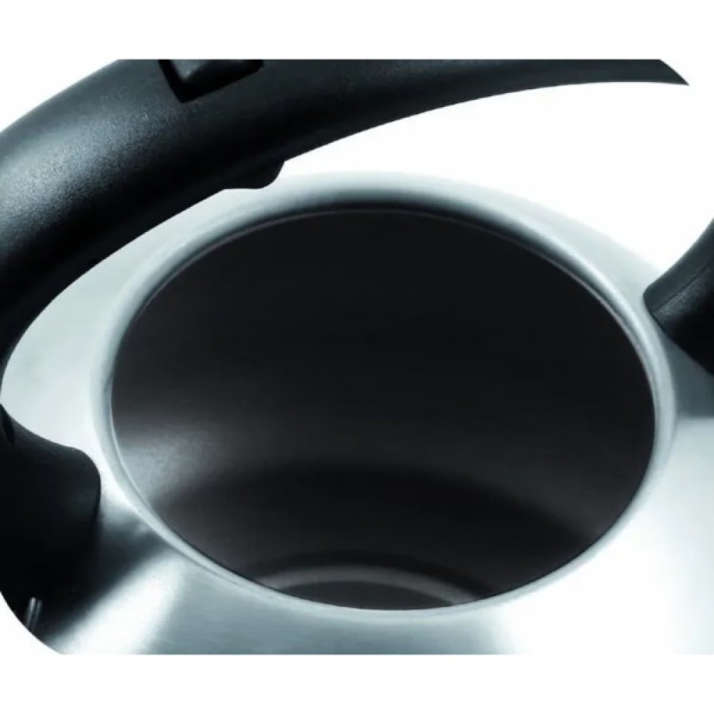 Tefal Duetto+ (N4180310) — чайник зі свистком на 2.5 л з нержавіючої сталі з чорними бакелітовими вставками. Ручка й носик з термоізоляцією, свисток з важелем для відкриття однією рукою, сумісність з усіма типами плит (включно з індукційними). Дно з потовщеним шаром для рівномірного нагрівання, полірована поверхня легко миється. Класичний французький чайник для щоденного використання.