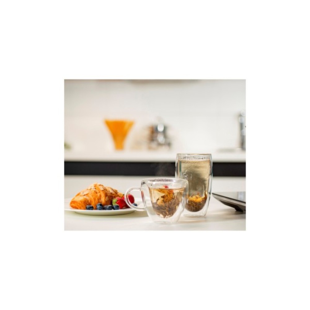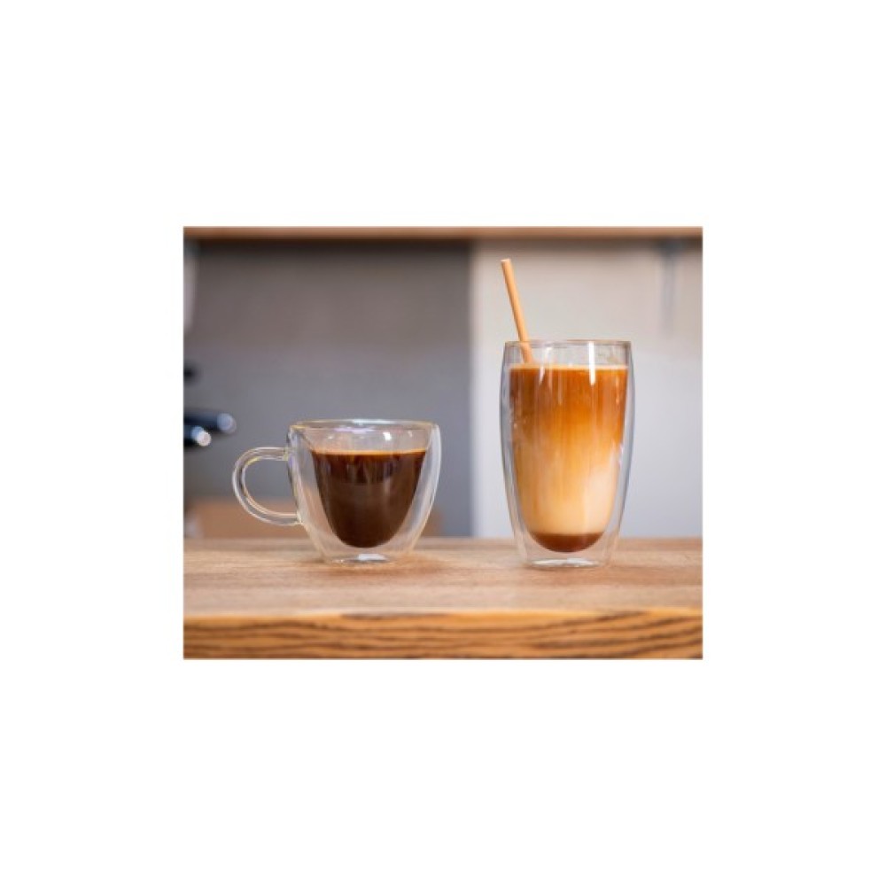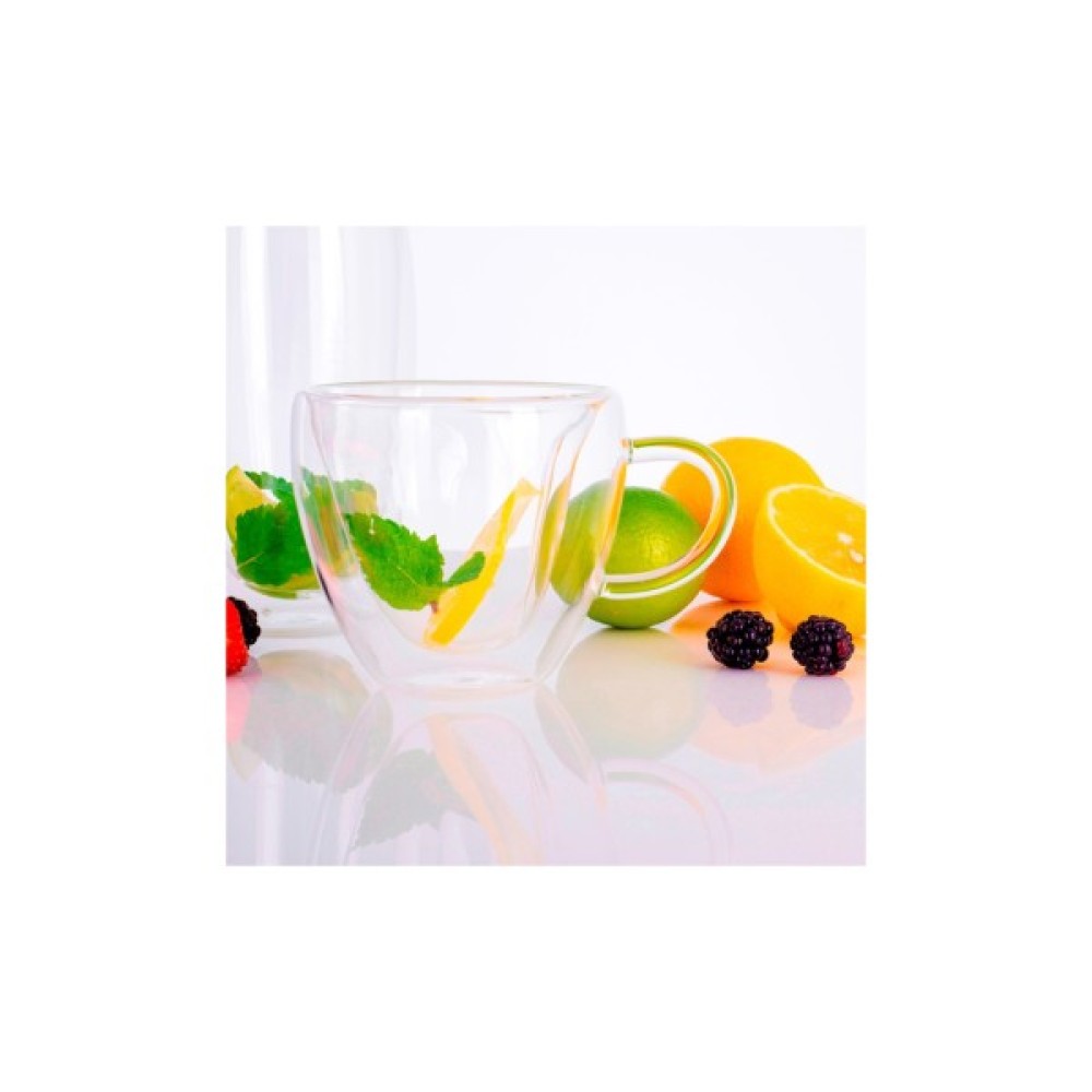 Термостійке скло, з якого виготовлені склянки, витримує перепад температури до +220 °C. Ви можете не побоюватися, що вона пошкодиться під час наливання окропу. Подвійні стінки дають змогу залишатися зовнішнім стінкам не гарячими. Ручка також залишається кімнатної температури. А напій у чашці довше залишиться гарячим.