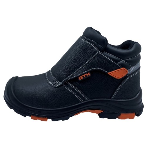 Черевики зварювальника GTM SM-070-професійна робоче взуття для повсякденного використання з захисним сталевим носком, який витримує ударне навантаження до 200 Дж. Верх черевик виготовлений з натуральної шкіри і доповнений спеціальними світловідбиваючими вставками. Зовнішній клапан для захисту від продуктів зварювання. Підошва: поліуретанова, двошаровий, лита. Має діелектричну, антистатичну і антиковзну обробку. Стійка до впливу масел, палива, агресивним розчинів кислот і лугів з концентрацією до 20% і контактному нагрівання до 300 С. Носок в черевиках має додаткову сталеву вставку, яка витримує ударне навантаження до 200 Дж. Енергопоглинаюча устілка з прошивкою проти ковзання. Антипрокольна сталева устілка із захистом до 1100 Н. Антикорозійний металева фурнітура і посилений шнурок