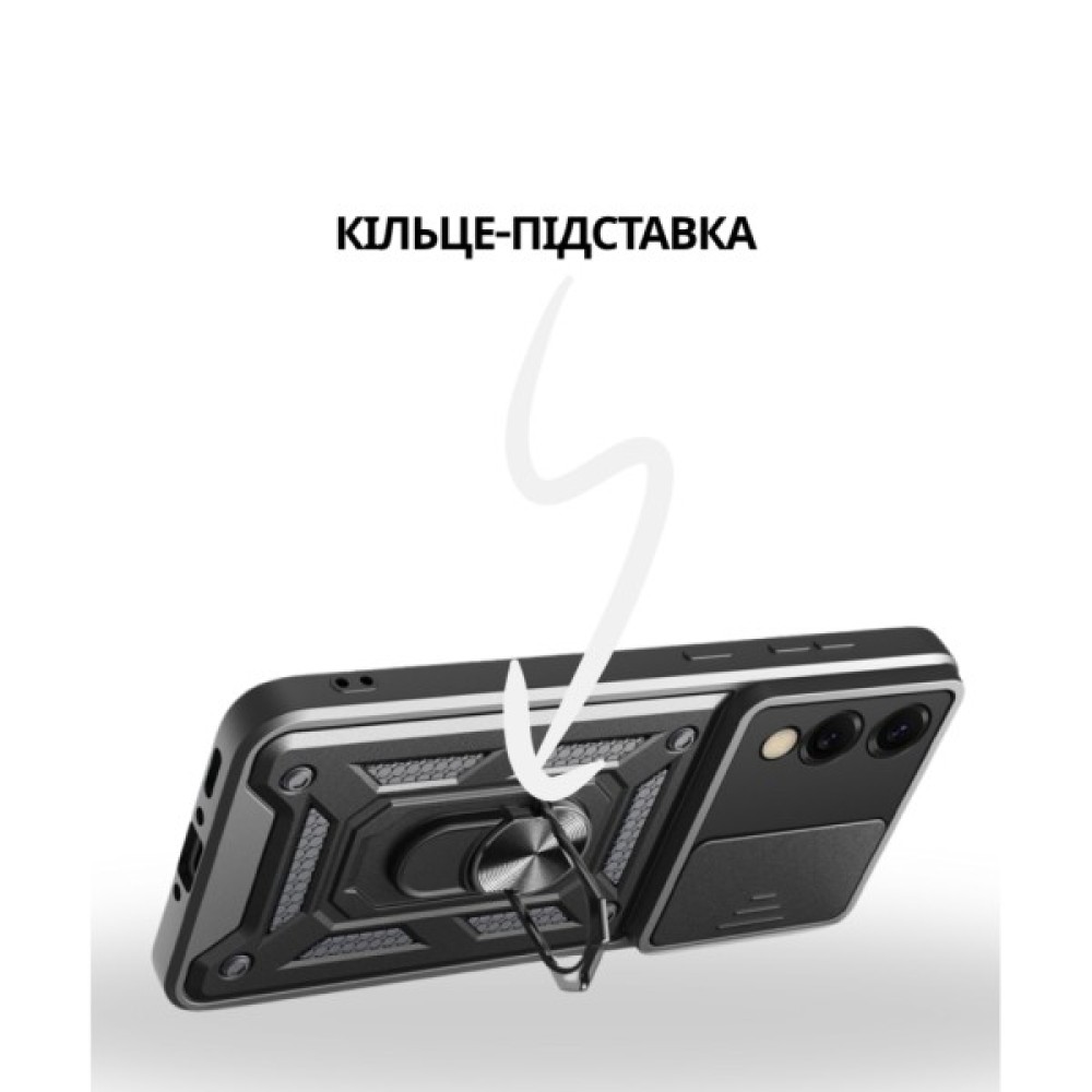 Гнучка силіконова панель має жорсткий металізований корпус та кільце-підставку для пальця. Чохол здатний витримати навіть сильні удари та подряпини.