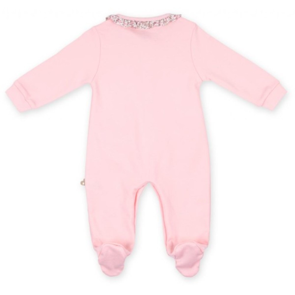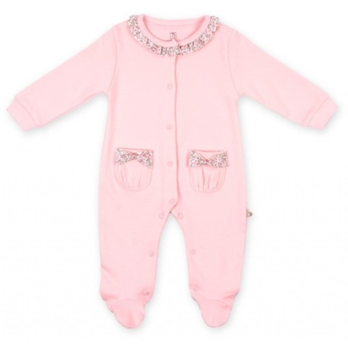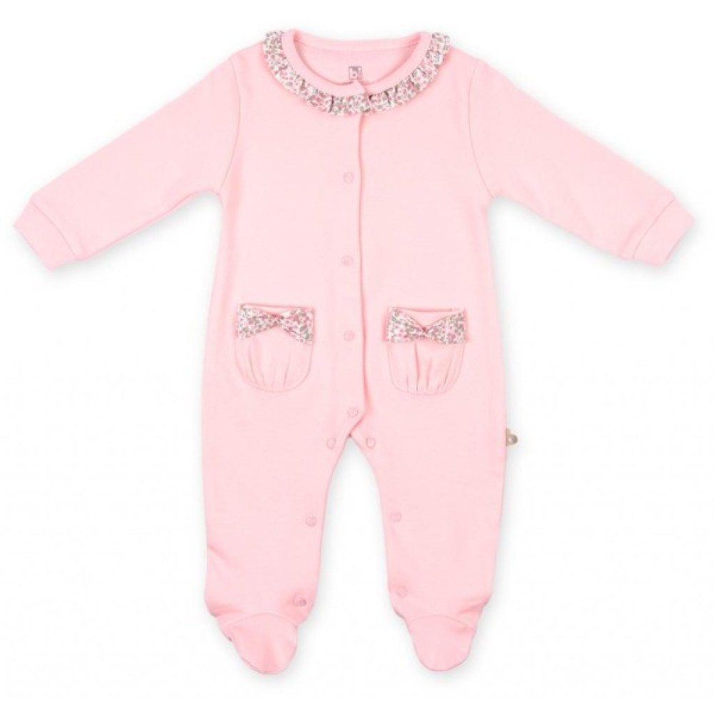 Комбінезон легко і швидко знімається і одягається, не створюючи ніякого дискомфорту, завдяки застібці на кнопочки по всій довжині. Кнопкова застібка розташована спереду по центру і розходиться до ніжок - це найзручніший варіант, якщо у вас дитина від 0 до 3 місяців. Ніжки зашиті, зі слідочкам. Круглий виріз горловини з квітчастим рюшем, окантований трикотажною бейкою. Довгі рукава з манжетами оформлені ніжною трикотажною резинкою. Прикрашений на стегнах милими накладними кишеньками з квітчастими бантиками.