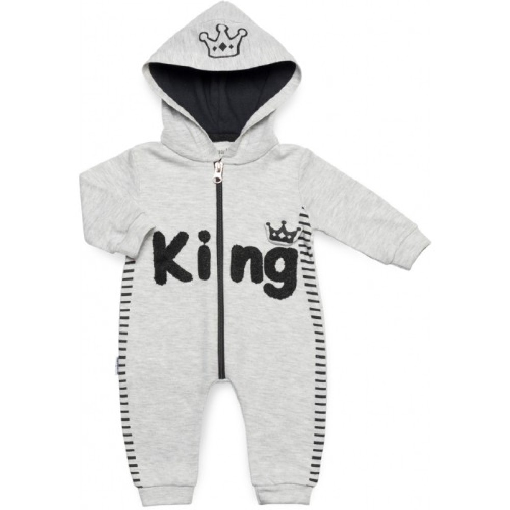 Симпатичний повсякденний світло-сірий комбінезон «KING» на блискавці з капюшоном, з якісного турецького трикотажу - незамінний одяг для вашого малюка.