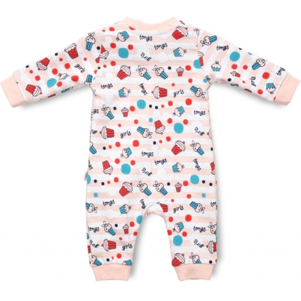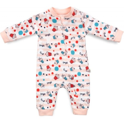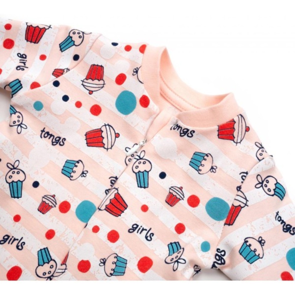 По всій поверхні прикрашений написами, різнокольоровими кружечками і капкейками. Тканина дуже м'яка, приємна на дотик. Застібається на потаємну блискавку з легким ходом. Вгорі є захист для підборіддя. Блискавка починається від центру горловини і спускається вниз до лівої ніжкі. Ніжки не зашиті, з трикотажними манжетами на щиколотках. Такий комбінезон ступні не прикриває, але зате зможе служити довше (у міру зростання малюка). Горловина і края рукавів оброблені м'якою трикотажною резинкою.