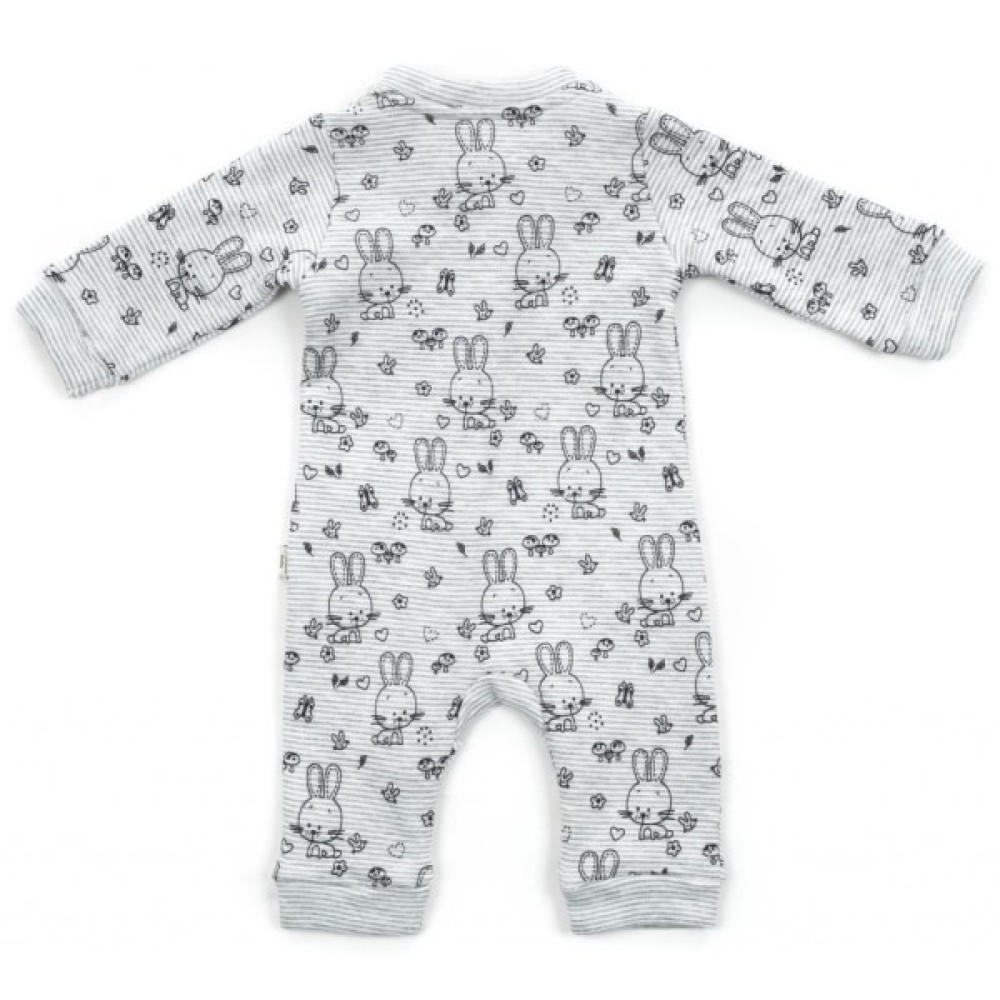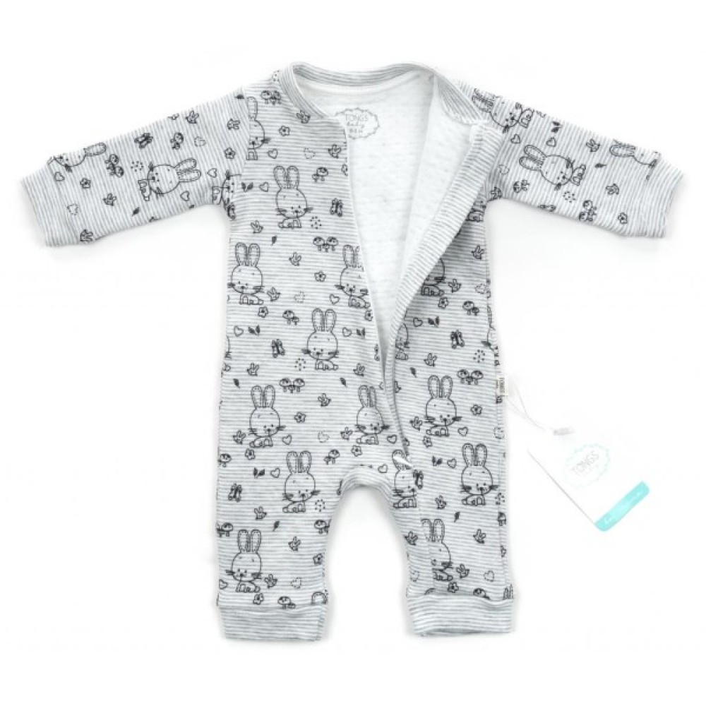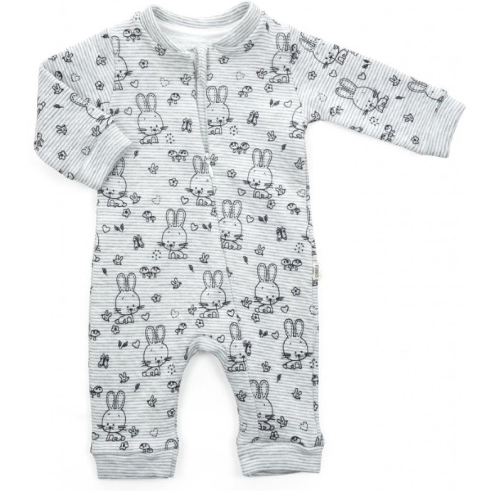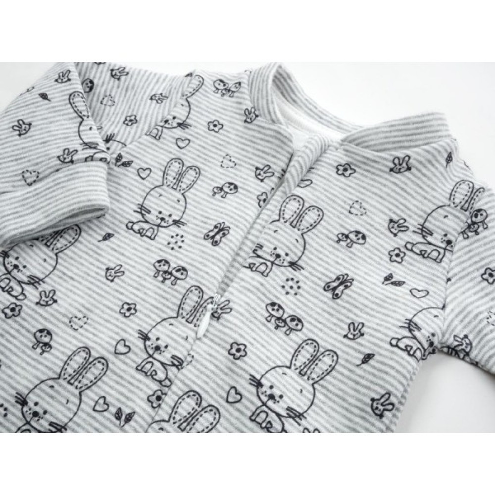 Чудовий натільний комбінезон - «чоловічок» - дуже зручний і незамінний одяг для Вашого малюка. Колірна основа чоловічка світла, в тонку сіру смужку. По всій поверхні прикрашений контурами зайчиків, сердечками, метеликами. Тканина дуже м'яка, приємна на дотик. Застібається на потаємну блискавку з легким ходом. Вгорі є захист для підборіддя. Блискавка починається від центру горловини і спускається до низу лівої ніжкі. Ніжки не зашиті, з трикотажними манжетами на щиколотках. Такий комбінезон ступні не прикриває, але зате зможе служити довше. Горловина і края рукавів оброблені м'якою трикотажною резинкою.