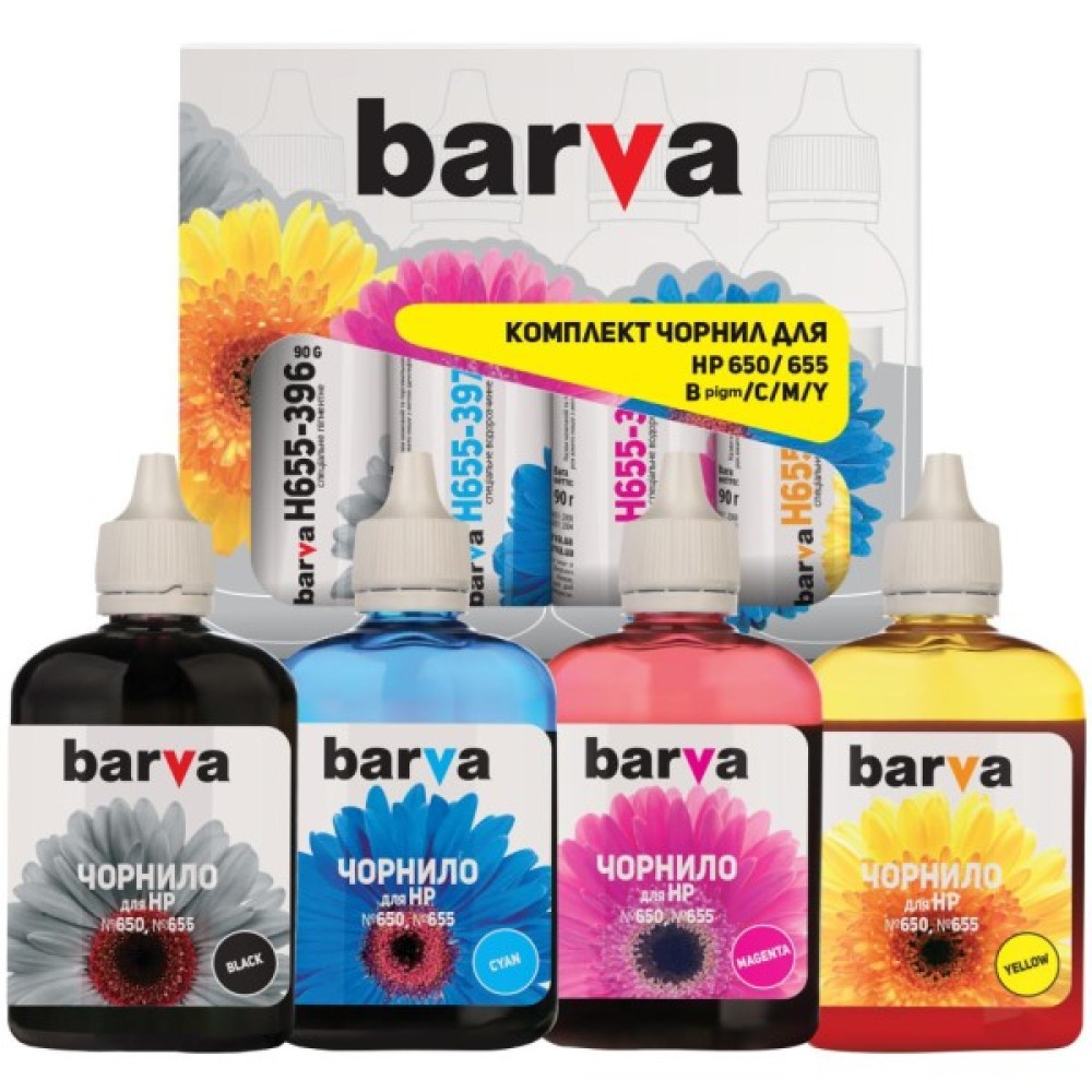Комплект чорнил для принтерів HP. Складається з чотирьох баночок різних кольорів: чорного, малинового, синього та жовтого. Об’єм однієї місткості — 90 грамів. Такої кількості фарби вистачить для друку значного обсягу документів та фотографій. Друк фото краще здійснювати на спеціальному фотопапері.