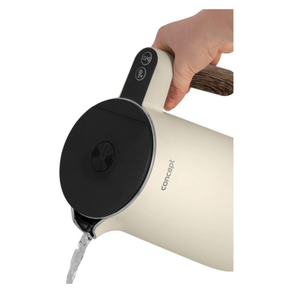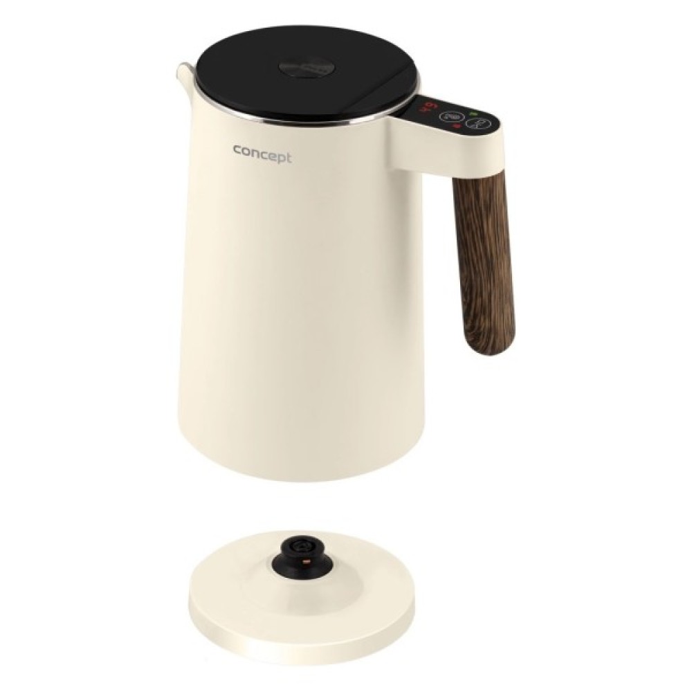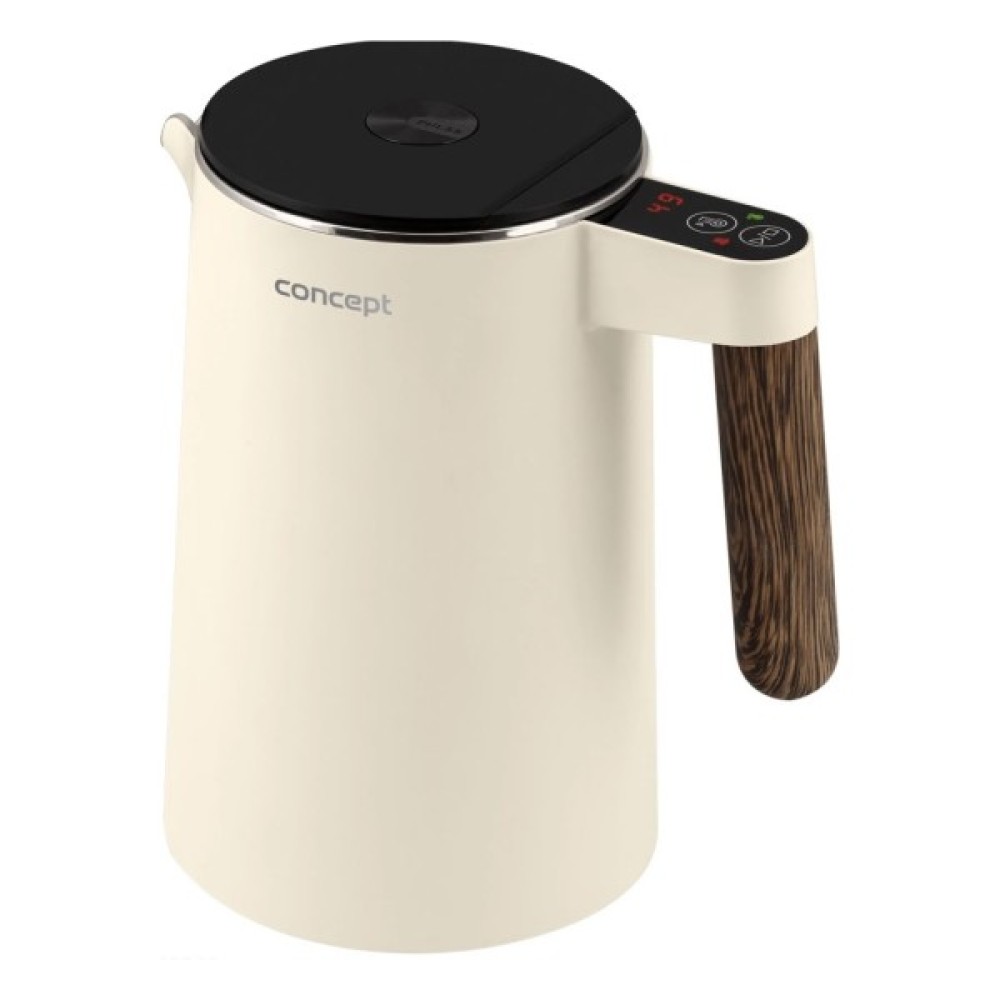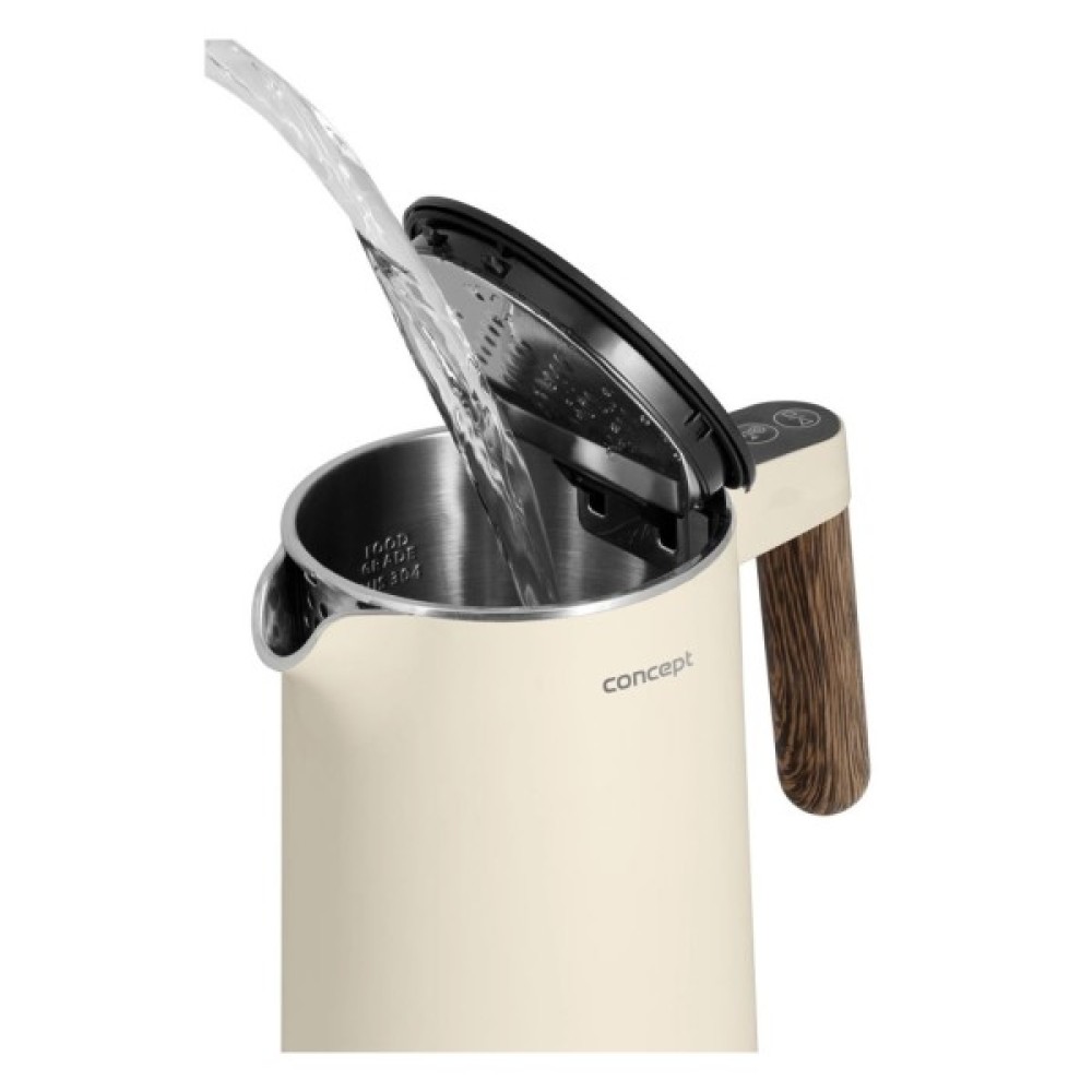 Електрочайник Concept RK3304 – це витончене поєднання стильного дизайну та функціональності, ідеальне доповнення до вашої кухні чи офісу. Його елегантний корпус, виконаний у ніжному ванільному кольорі з матової нержавіючої сталі, надійно підкреслений деталями з імітацією дерева, що надає приладу природного шарму. Завдяки об’єму 1.5 літра, цей чайник здатен забезпечити до шести чашок улюблених напоїв — ідеально для родини чи приємного обіду з друзями.
