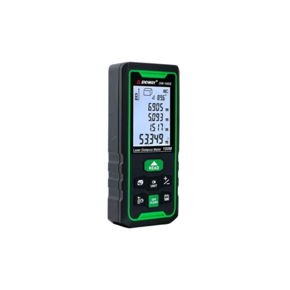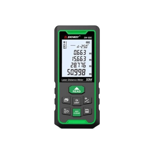 Лазерна рулетка (далекомір) SNDWAY SW-50G дозволяє розраховувати відстані і довжину до 50 метрів. Її головна особливість – зелений лазерний промінь. Його чітко видно як при недостатньому освітленні – в кімнатах без вікон, підвалах тощо, так і при надмірному – в сонячний день на вулиці. Це дозволяє рулетці бути універсальним і незамінним у роботі будівельника інструментом. Широкий функціонал далекоміра приємно дивує. Система може обчислювати площу, об'єм, а також проводити розрахунки, засновані на теоремі Піфагора. Це означає, що Ви можете дізнатися висоту об'єкта, перебуваючи на відстані від нього. Приємним бонусом цієї моделі стало наявність цифрового рівня і підсвічування кнопок. Також, SW-50G вимірює кути до 90°. Таким чином, Ви купуєте 2 інструменту за ціною одного – і лазерну рулетку, і кутомір.