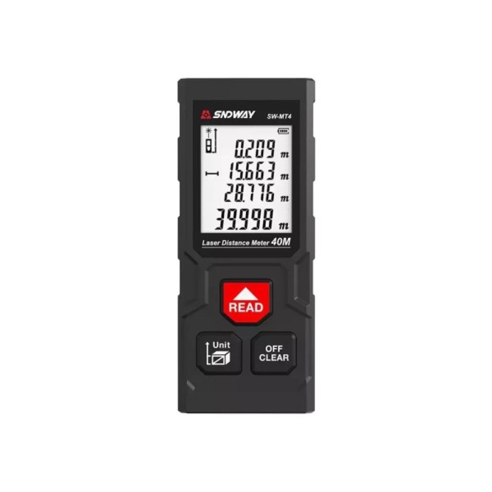 Лазерний далекомір SNDWAY SW-MT4 – це високотехнологічна цифрова багатофункціональна лазерна лінійка від відомої фірми SNDWAY. Прилад гранично простий у використанні, точний у вимірах, надійний і дозволяє вимірювати відстань (довжину), площі та об'єм.