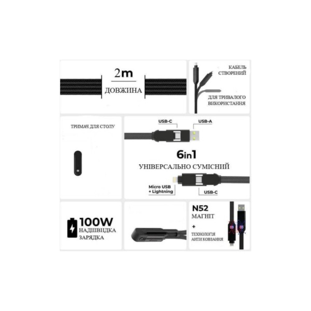 • 6 в 1 — підтримує всі популярні типи з’єднань: USB-A → USB-C; USB-A → Lightning; USB-A → Micro USB; USB-C → USB-C; USB-C → Lightning; USB-C → Micro USB