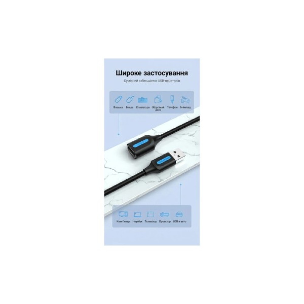 Кабель-подовжувач Vention USB 2.0 (0.5 м, тато на мама, 480 Мбіт/с, екранований, нікельовані контакти, чорний)