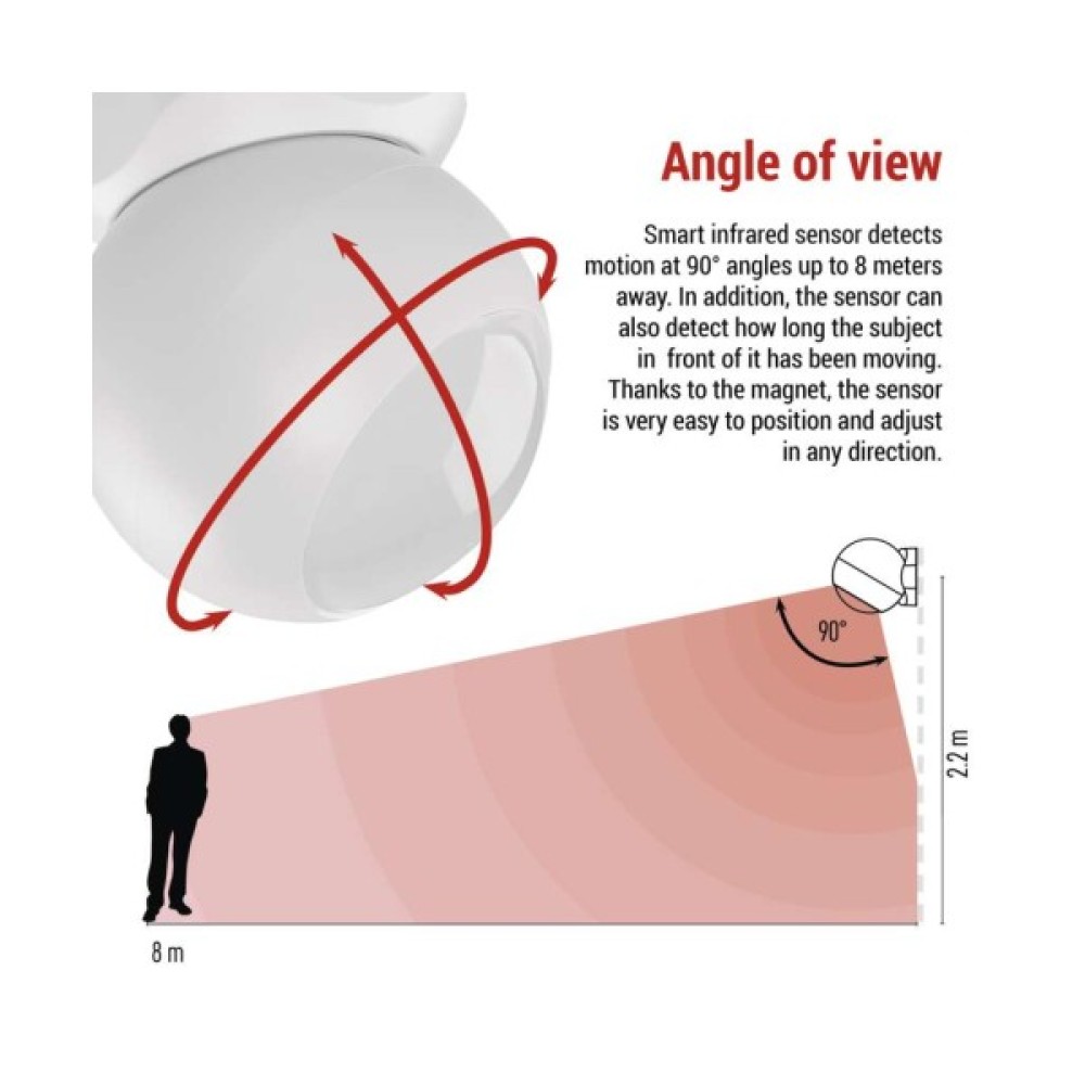 Зробіть крок у безпечніше та енергоефективніше майбутнє з нашим компактним і універсальним інтелектуальним датчиком руху. Датчик фіксує рух під кутом 90 градусів на відстані до 8 м, а завдяки інфрачервоному випромінюванню не пропустить нічого навіть за поганого освітлення. При виявленні руху датчик надсилає сповіщення на мобільний пристрій через застосунок, доступний для Android та iOS. Датчик руху GoSmart також може визначати тривалість перебування, тобто як довго хтось знаходиться у контрольованій зоні. Таким чином, він частково може замінити датчик присутності.