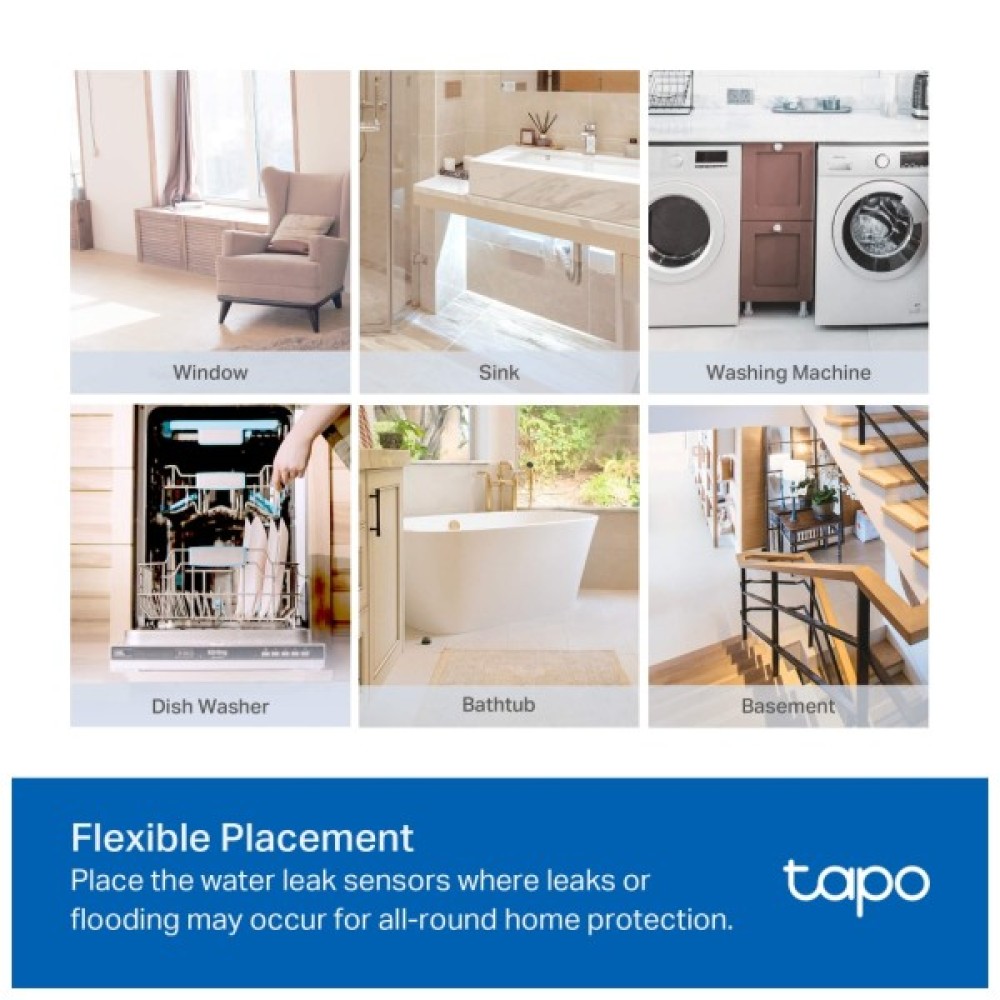 Універсальне використання, гнучке розміщенняРозмістіть датчик витоку води там, де можуть статися витоки або затоплення, наприклад, у ванних кімнатах, кухнях, пральнях тощо. Назвіть датчики та легко керуйте ними всіма в додатку Tapo.