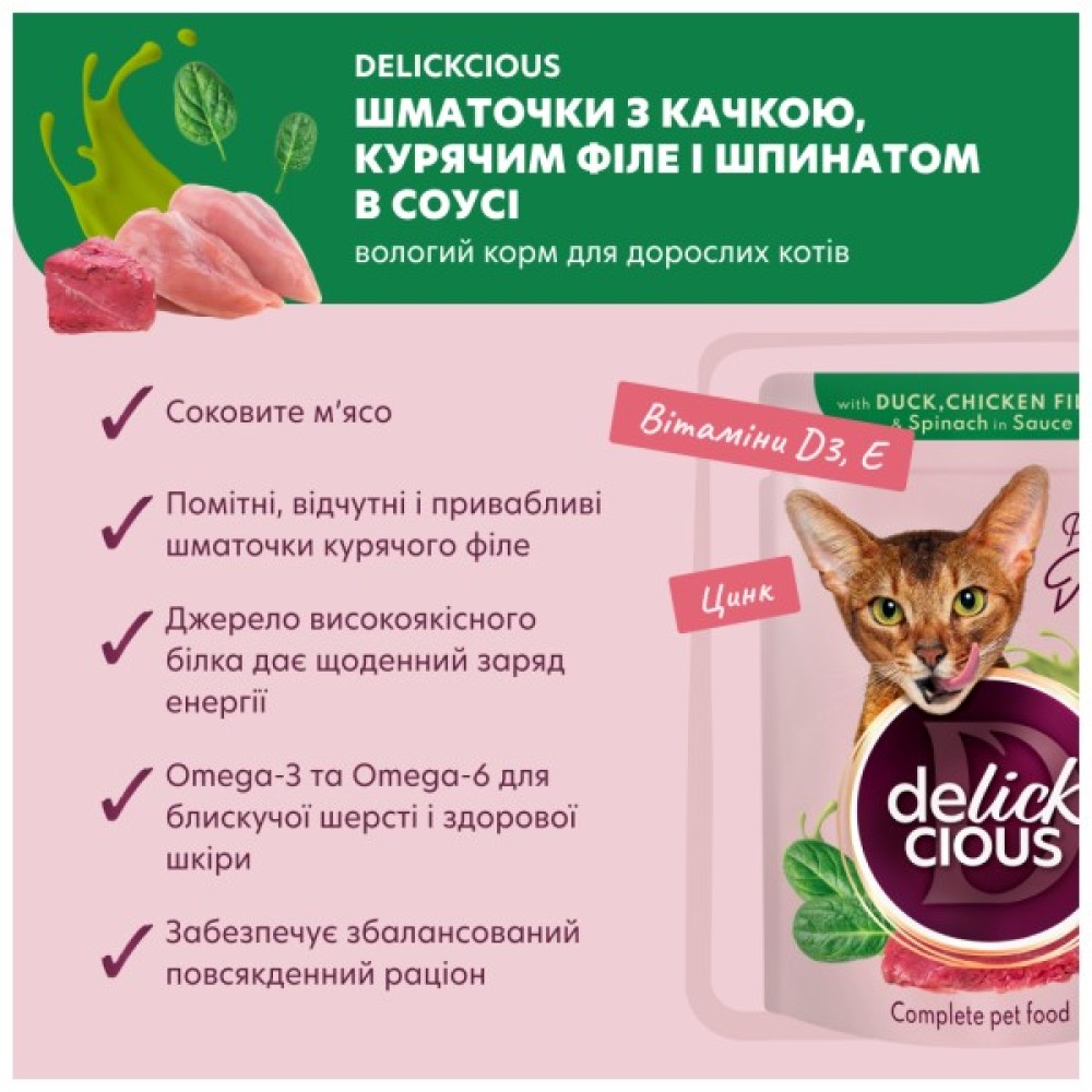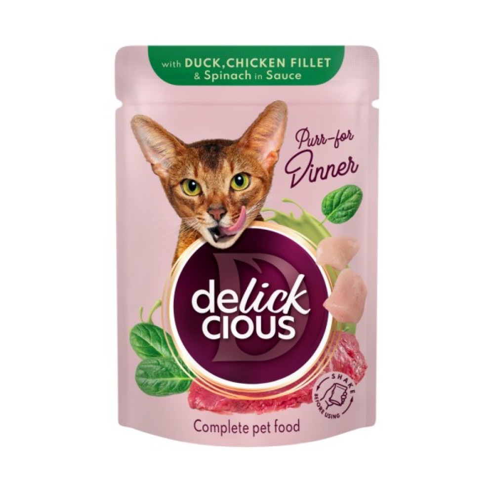 Вологий корм для кішок Delickcious "Шматочки з качкою, курячим філе і шпинатом в соусі" - це ідеальне рішення для збалансованого годування вашого улюбленця. Завдяки високому вмісту м'яса (87%), корм легко задовольнить навіть найвибагливіші смаки котів. Смачне куряче філе (10%) та ніжна качка (4%) гармонійно поєднуються з поживним шпинатом (1%), що створює повноцінний набір білків і вітамінів.