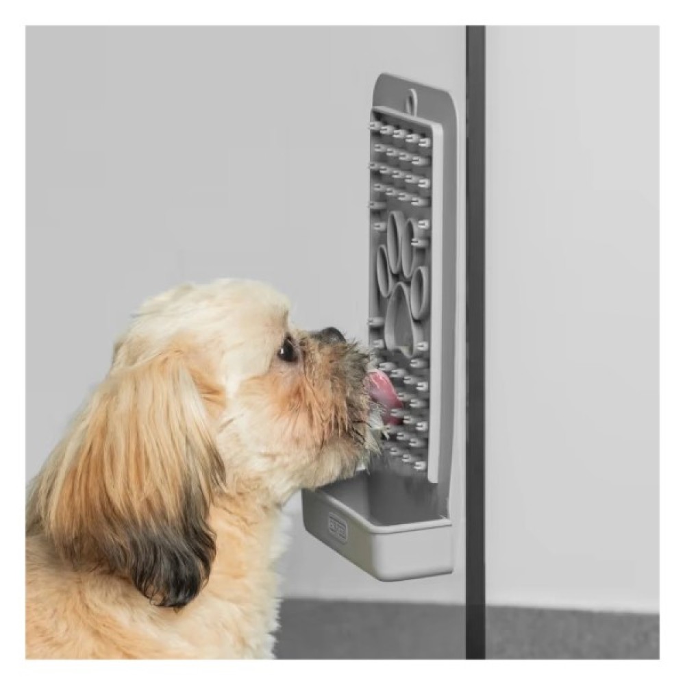 Розподіліть улюблені ласощі вашого собаки по всій довжині м’яких силіконових щетинок (арахісове масло або йогурт підійдуть найкраще). Далі прикріпіть килимок на будь-яку поверхню: на ванну під час купання, на скляні дверцята душової кабіни на посудомийну машину та багато інших поверхонь.