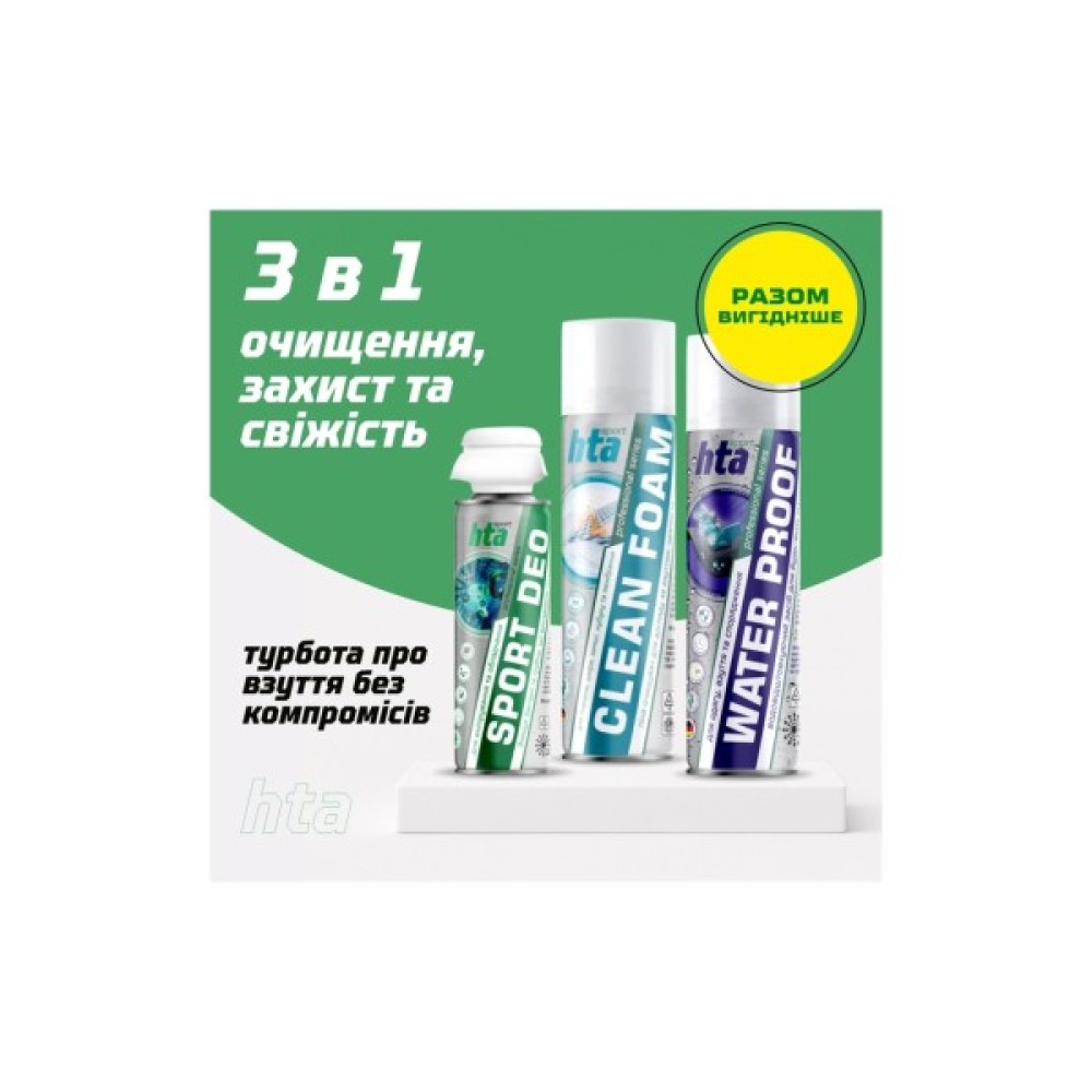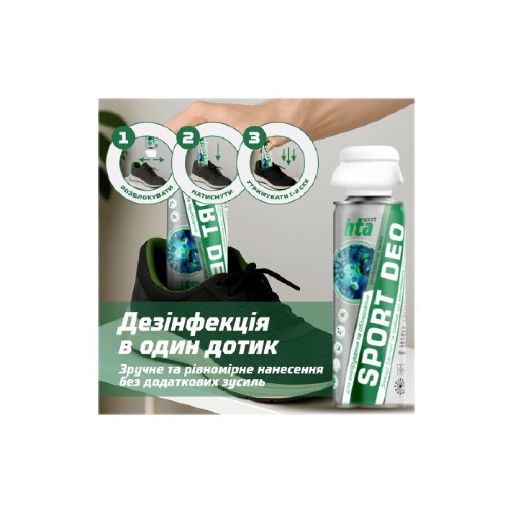 Антибактеріальний дезодорант HTASport Deo 200 мл ефективно нейтралізує неприємні запахи й дезінфікує спортивне взуття, вироби з текстилю, шоломи та спортивні сумки. Після нанесення не залишає слідів і плям.