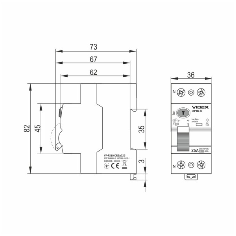 Диференційне реле (ПЗВ) Videx RESIST АС 2п 30мА 10кА 25А (VF-RS10-DR2AC25)