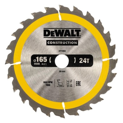 Диск пильний DeWALT CONSTRUCTION, 165х20 мм, 24z (ATB), +10 град (DT1934)