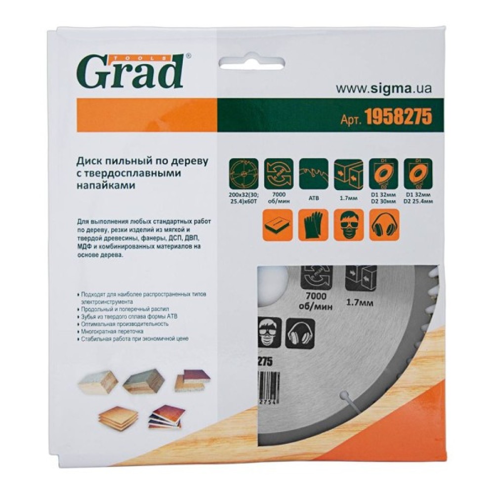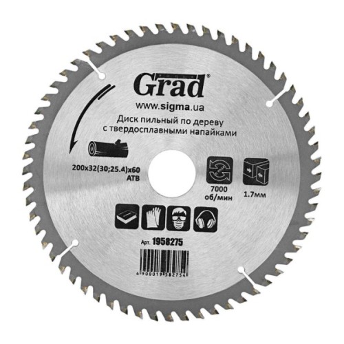 Диск пильний Grad по дереву з твердосплавними напайками Ø200×32(30;25.4)×60Т, 7000об/хв GRAD (1958275) (1958275)