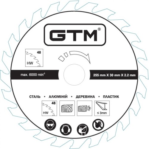 Диск пильний GTM 255*30*2,2/1,7мм z=48 сталь, алюміній, деревина, пластик (11435)