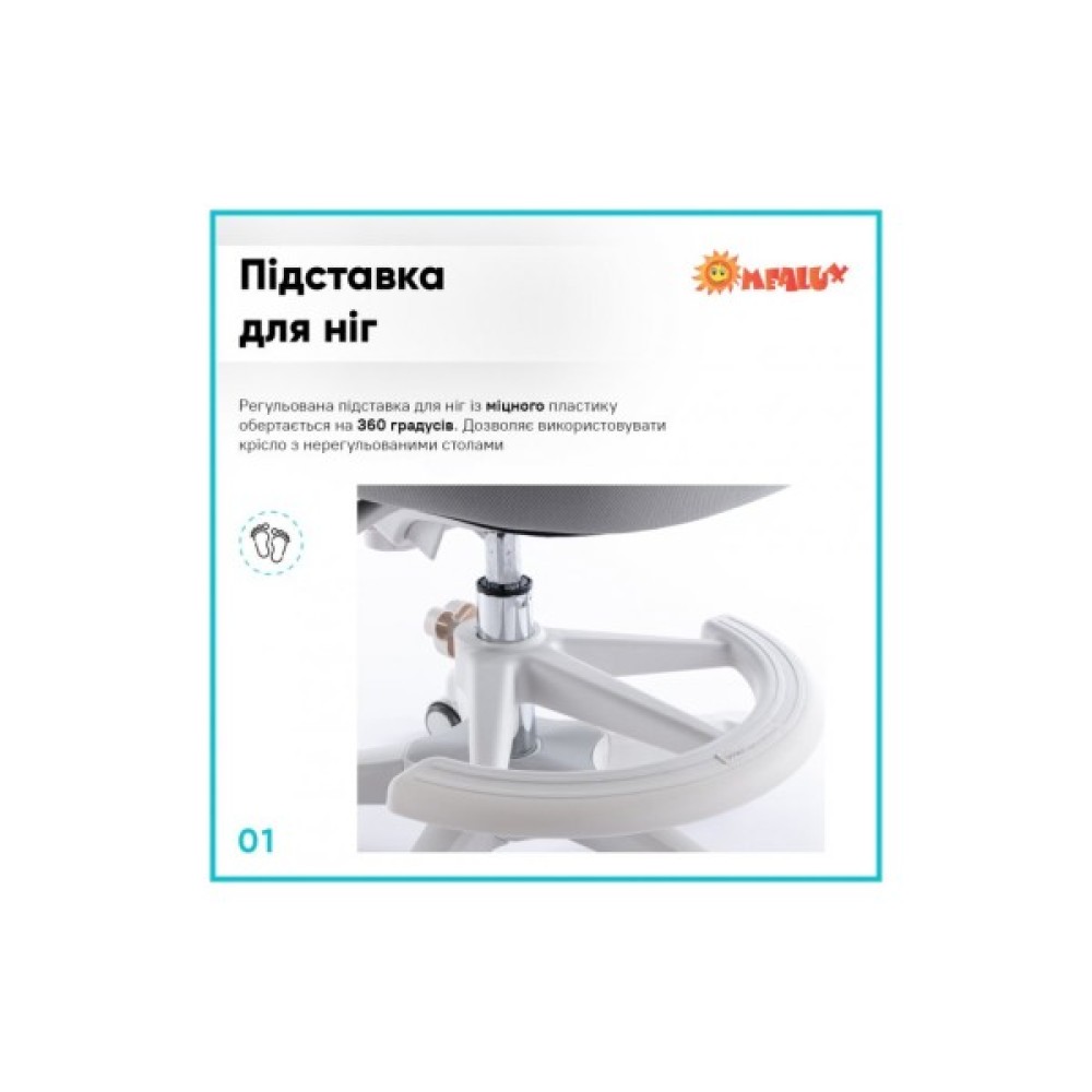 Регульована підставка для ніг із міцного пластику обертається на 360 градусів. Наявність підставки дає змогу використовувати крісло зі столами, що не регулюються.