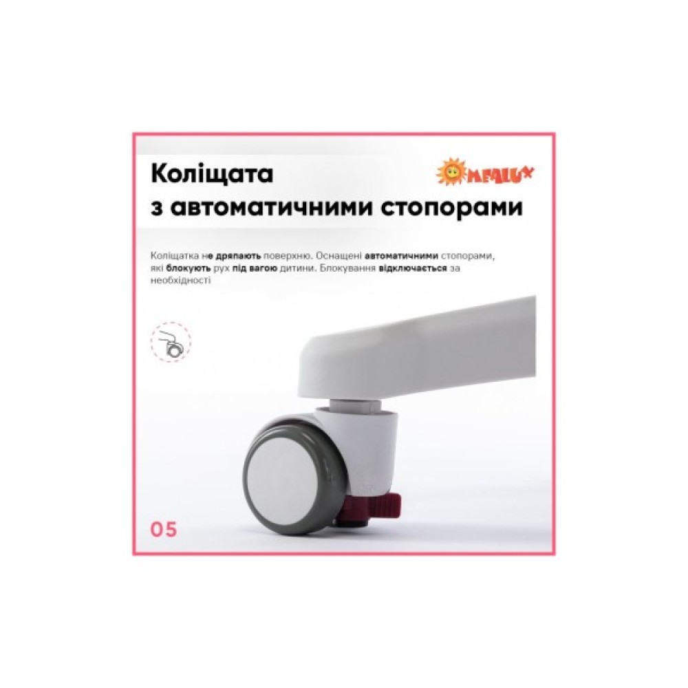 Нейлонові коліщатка автоматично блокуються під навантаженням від 20 кг. Блокування вимикається спеціальними стопорами.