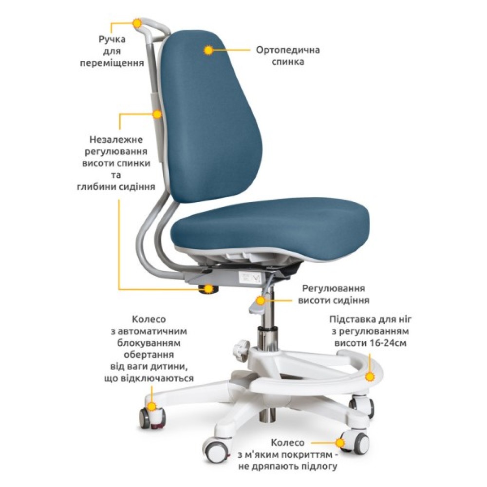 У крісла незалежне регулювання висоти спинки та сидіння. Газліфт забезпечує плавну зміну висоти всієї конструкції. Глибина сидіння регулюється окремим важелем. Велика кількість регулювань дозволить використовувати крісло як 4-річній дитині, так і школяру старших класів.
