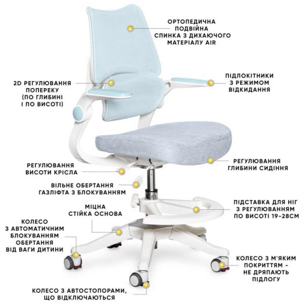 Наступна особливість – подвійна ергономічна спинка з дихаючого матеріалу Air, що розділена по горизонталі та має додаткові налаштування. Нижня частина спинки регулюється по висоті та змінює кут нахилу для покращеної підтримки поперекового відділу хребта. Завдяки можливості налаштування зменшується навантаження на спину і з часом покращується постава дитини. Сидіння повторює анатомічні вигини тіла та регулюється по глибині, що дозволяє підлаштовувати крісло під швидкозростаючий організм дитини. Висота крісла регулюється завдяки плавному газліфту, що витримує навантаження до 100 кг.