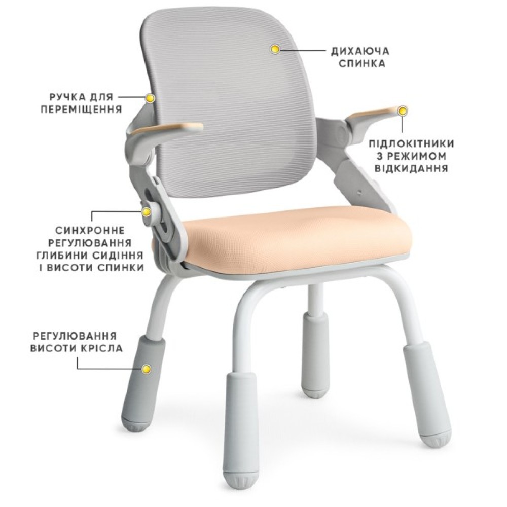 4. Регульована висота сидіння: Крісло адаптується до зросту дитини завдяки регулюванню на ніжках, забезпечуючи правильне положення тіла.