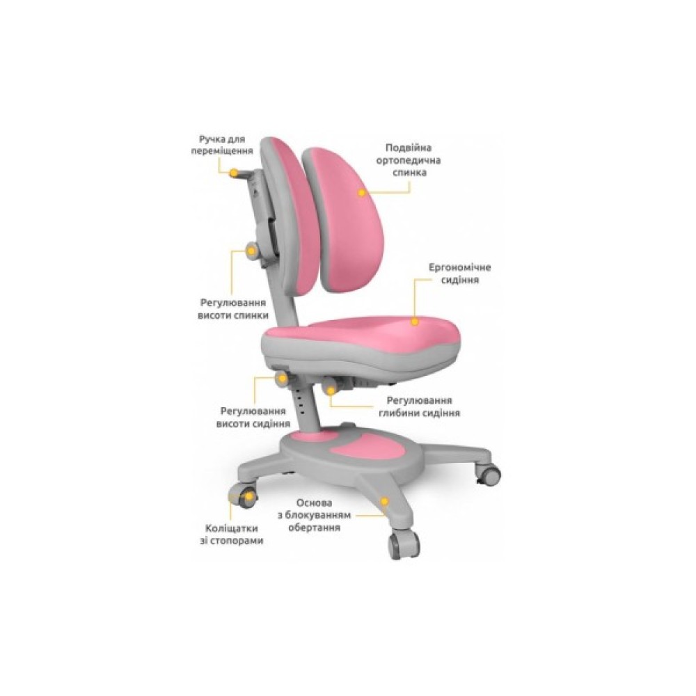 Стілець Mealux Onyx Duo з подвійною конструкцією спинки створює відмінну підтримку спини. Дитина буде сидіти комфортно, зможе краще концентрувати свою увагу, і заняття будуть проходити ефективніше. Можна точно настроїти для дитини потрібну глибину сидіння (є спеціальна "протисколіозна" виїмка на сидінні). Також регулюються незалежно один від одного висота спинки і висоти сидіння з допомогою затискачів. Стійка конструкція має широку основу з п'ятьма колесами. На трубі зверху розміщена ручка для зручного переміщення.