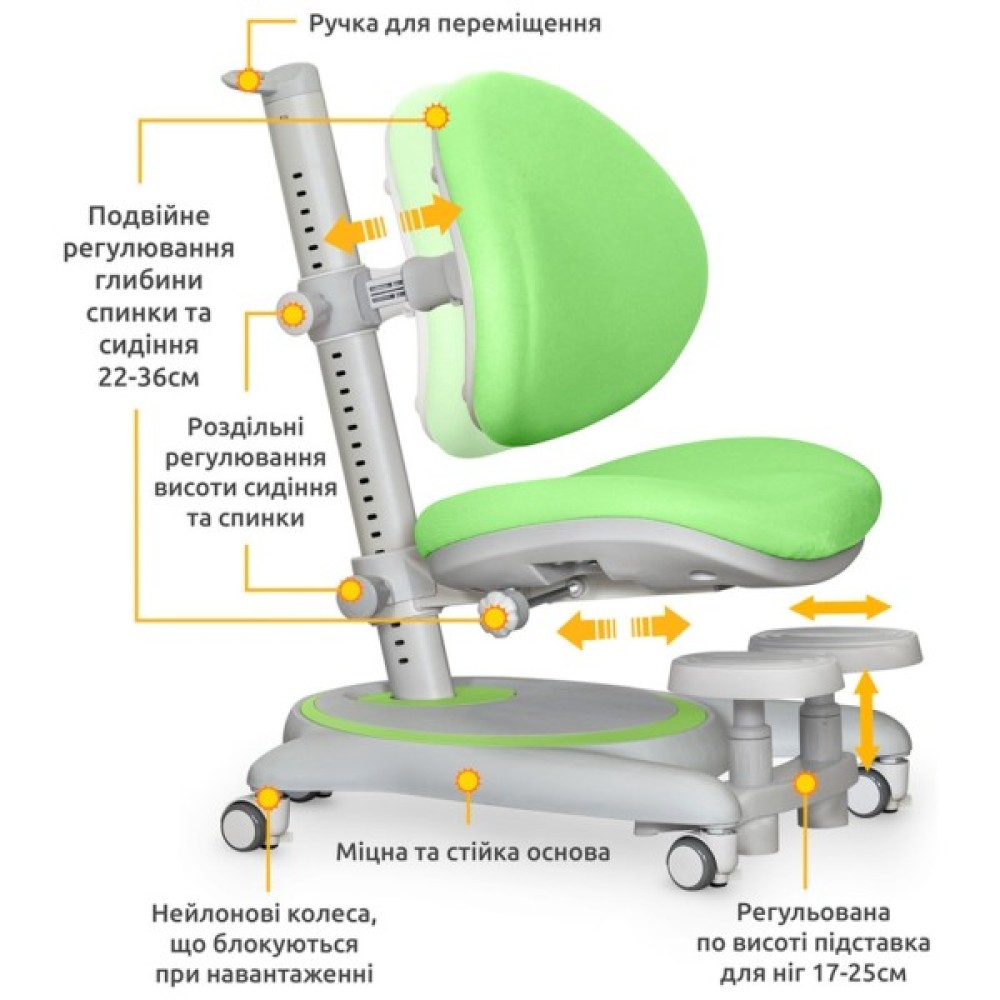 У крісла незалежне регулювання висоти спинки та сидіння. Регулювання здійснюється за допомогою спеціальних гвинтів на металевій трубі. Глибина сидіння регулюється ручкою фіксатором. Крісло підійде для дітей від 3 років до дорослого віку.