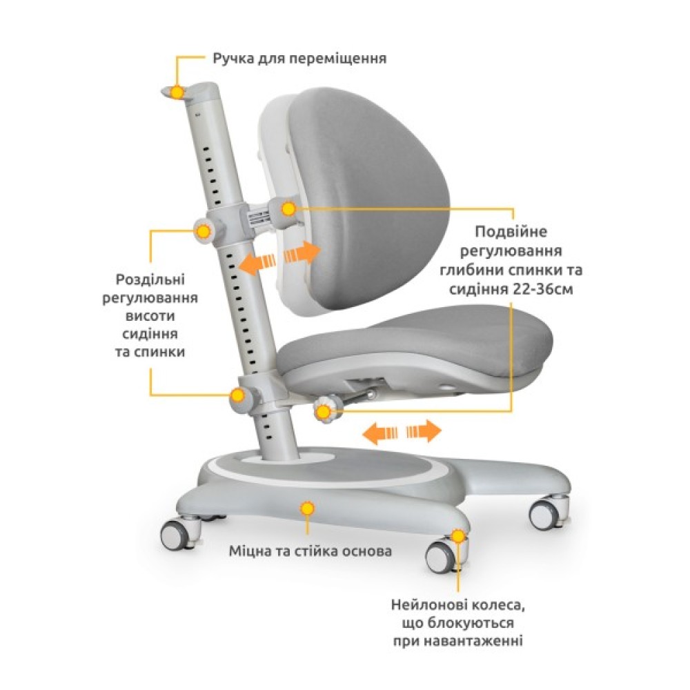 Крісло підійде для дітей від 3 років до дорослого віку. Спинка ортопедичної форми щільно прилягає до спини, підтримуючи правильну поставу, а також створює максимальний комфорт під час занять. На стійкій основі кріпляться нейлонові коліщатка, які автоматично блокуються при навантаженні на крісло. Блокування легко відключається спеціальними стопорами.