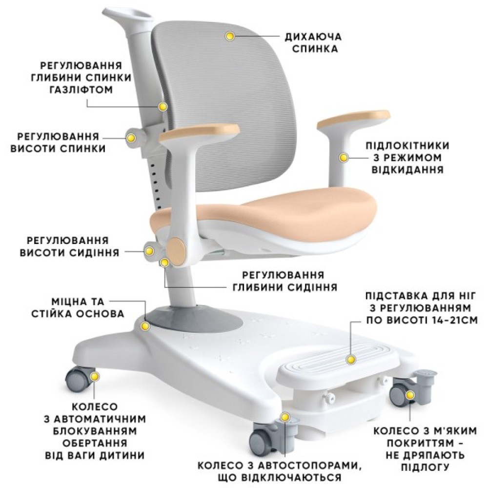 • Підставка для ніг з регулюванням по висоті (14-21 см): Додаткова підтримка для ніг, яка регулюється по висоті, забезпечує комфорт навіть для найменших користувачів.
