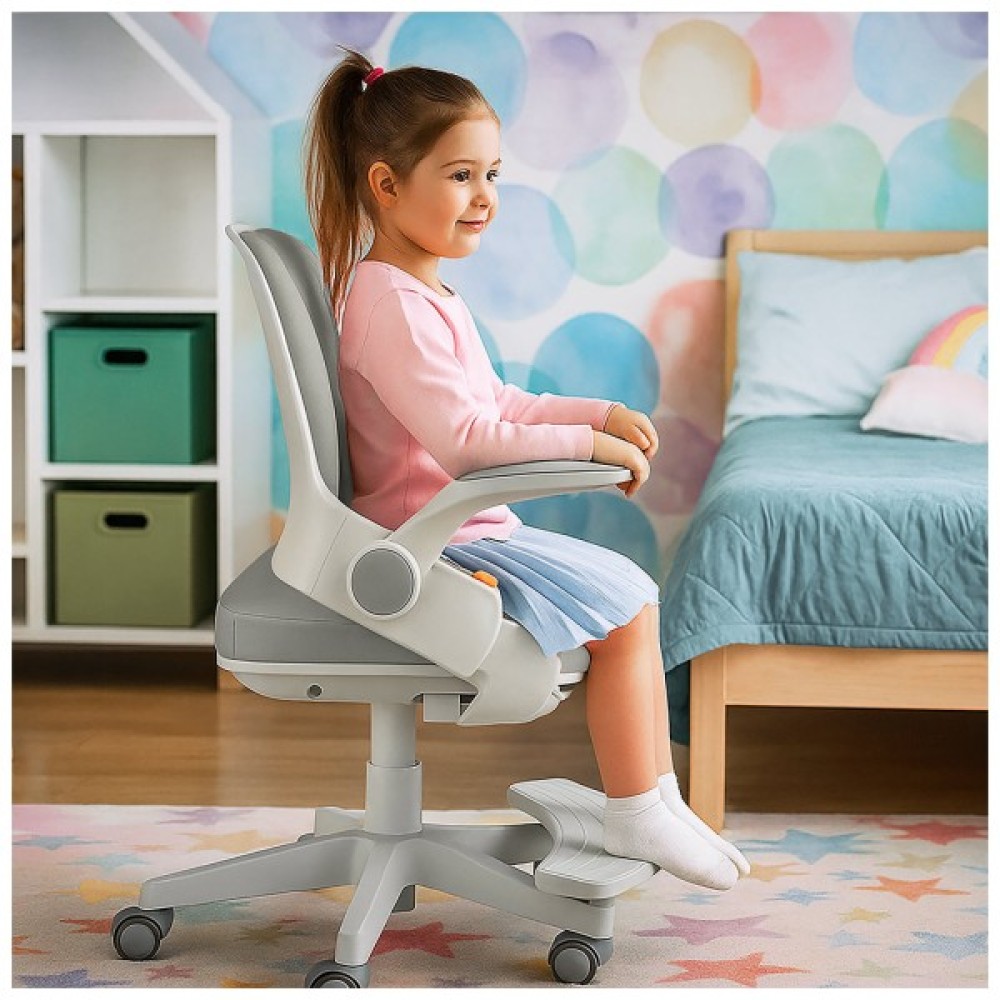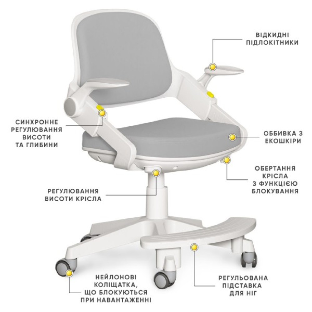 • Відкидні підлокітники: Підлокітники зручно відкидаються, дозволяючи дитині легко підсунутись ближче до столу. Це сприяє вільним рухам і правильному розташуванню рук під час навчання