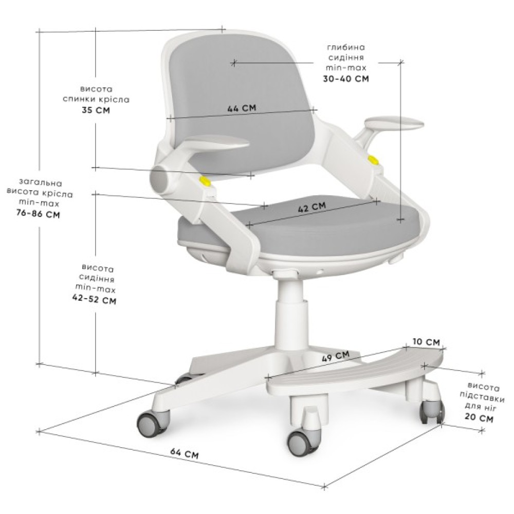 Регулювання: висота сидіння; глибина сидіння; підставка для ніг