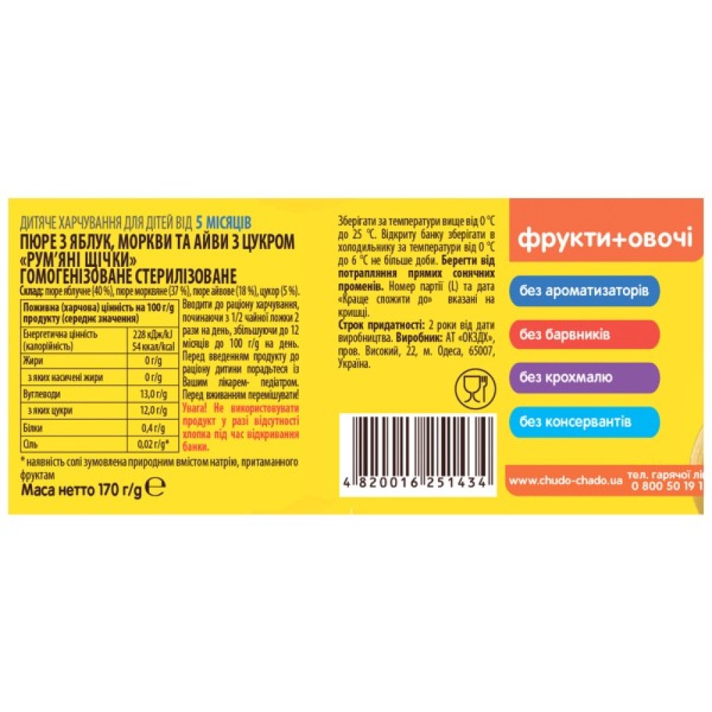 Дитяче, пюре, ЧудоЧадо, Яблуко, морква, і, айва, з, 5, місяців, 170, г, 4820016251434