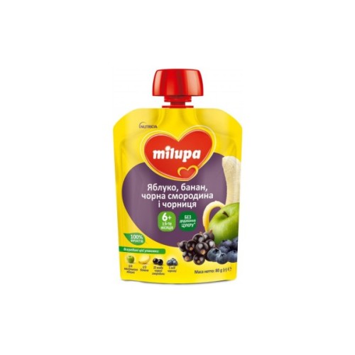 Фруктове пюре «Яблуко, банан, чорна смородина та чорниця» Milupa в зручному форматі м'якої упаковки — це смачне та корисне пюре для малюків від 6 місяців. Ніжне поєднання яблука, банана та корисних ягід чорної смородини та чорниці не залишить вашого янголятка байдужим до нового смаку. А завдяки компактному формату, малюк зможе їсти улюблене пюре будь-коли: під час прогулянок, подорожей або в гостях. Також пюре в м'якій упаковці беззаперечно стане справжнім помічником у розвитку дрібної моторики ручок і навичок самостійності у вашої крихти.