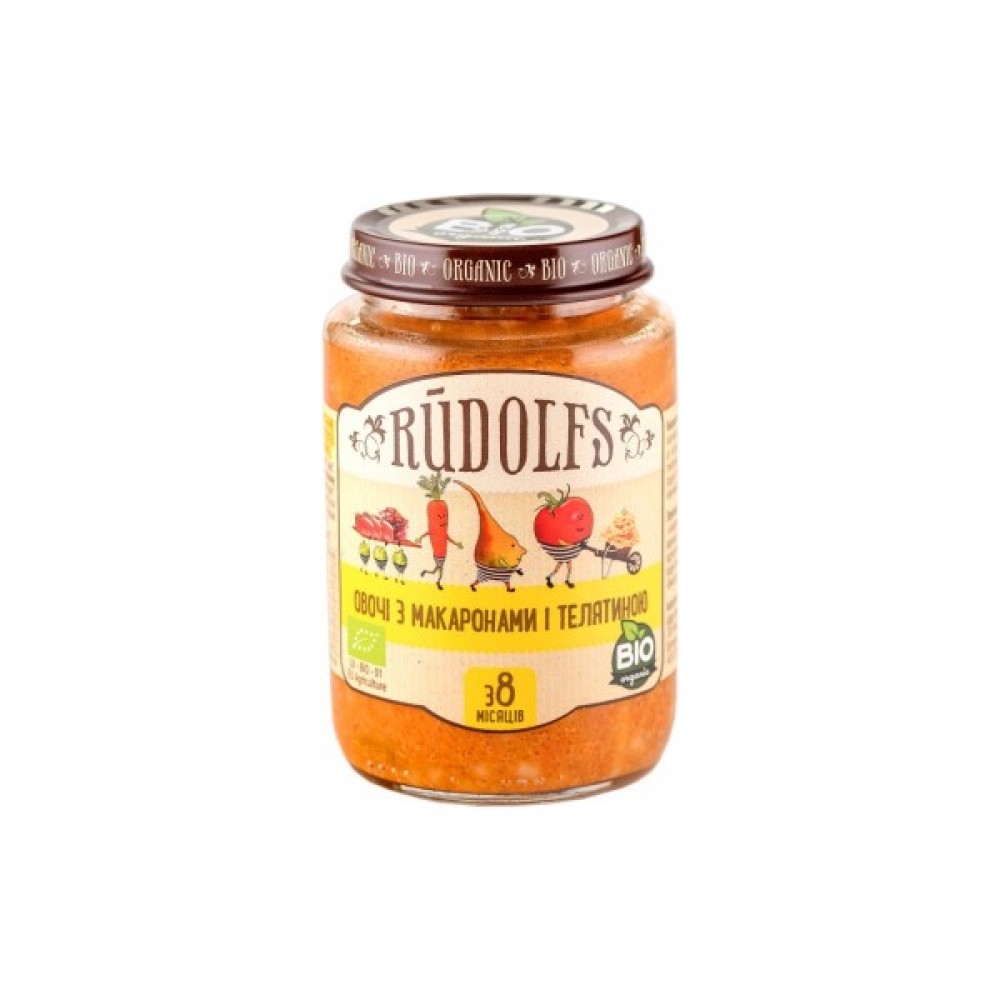 ОВОЧІ З МАКАРОНАМИ І ТЕЛЯТИНОЮ органічне овоче-м’ясне пюре зі шматочками продуктів для дітей з 8 місяців ТМ Rudolfs (Рудолфс)