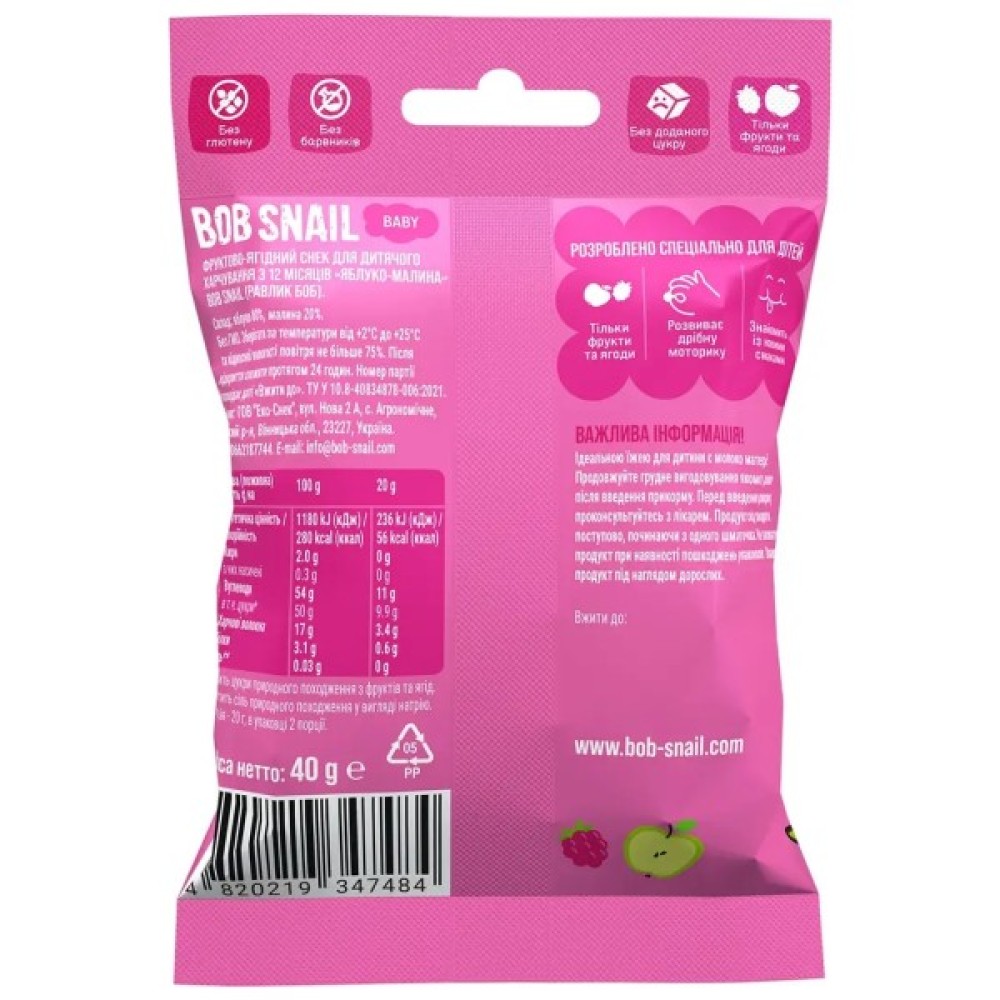 Дитячі снеки Bob Snail фруктові яблуко-малина 40 г (1740859)