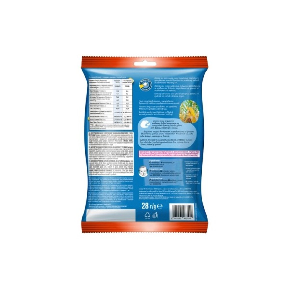 борошно кукурудзяне 84.6%, олія соняшникова з високим умістом олеїнової кислоти, порошок полуниці 3.6% (полуниця 3.4%*, загущувач пектин, емульгатор лецитини), банани в порошку 2.4 %, кальцію карбонат, заліза фумарат, цинку сульфат, антиоксидант (альфа-токоферол), вітамін В1.