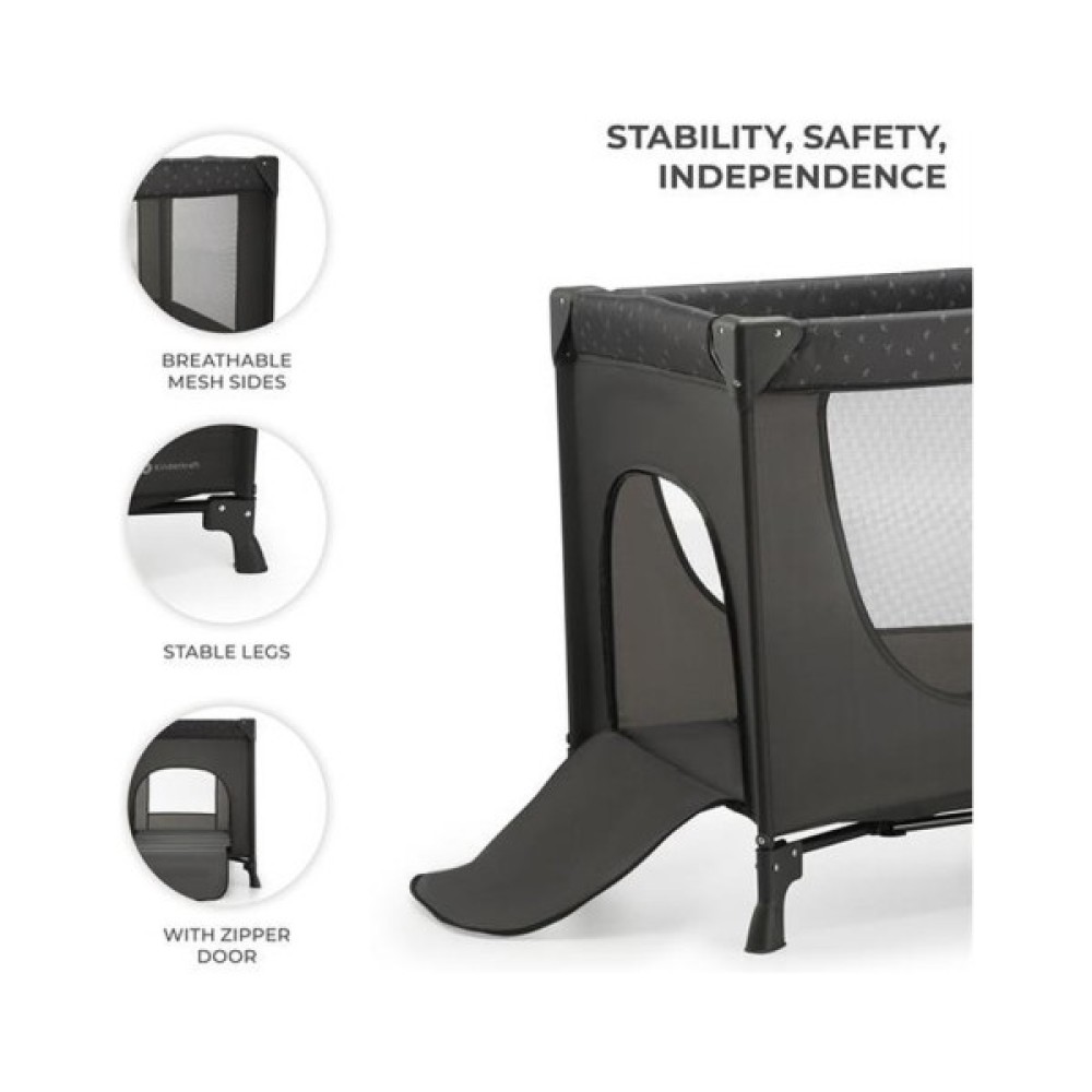 Сітчасті стінки JOY LIGHT дадуть вам змогу стежити за вашим малюком у будь-який час, а практичний вхід, що закривається на блискавці, дає змогу вашій дитині, яка повзає, вільно залишати ліжечко, коли їй захочеться.