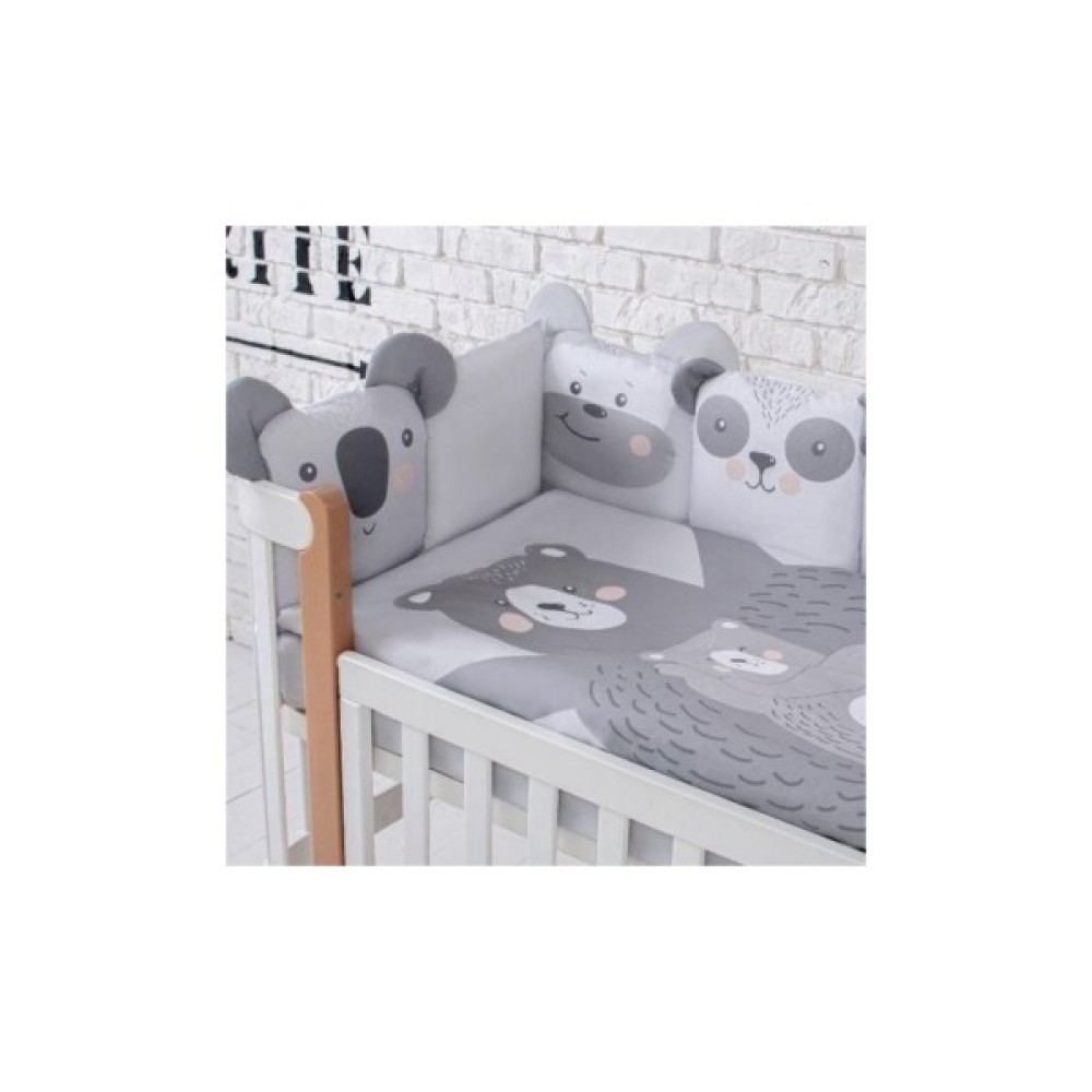 Zoo grey - постільний комплект з колекції Cuties. 6 з 8 подушечок захисту виконані у вигляді мордочок тваринок з об`ємними вушками.