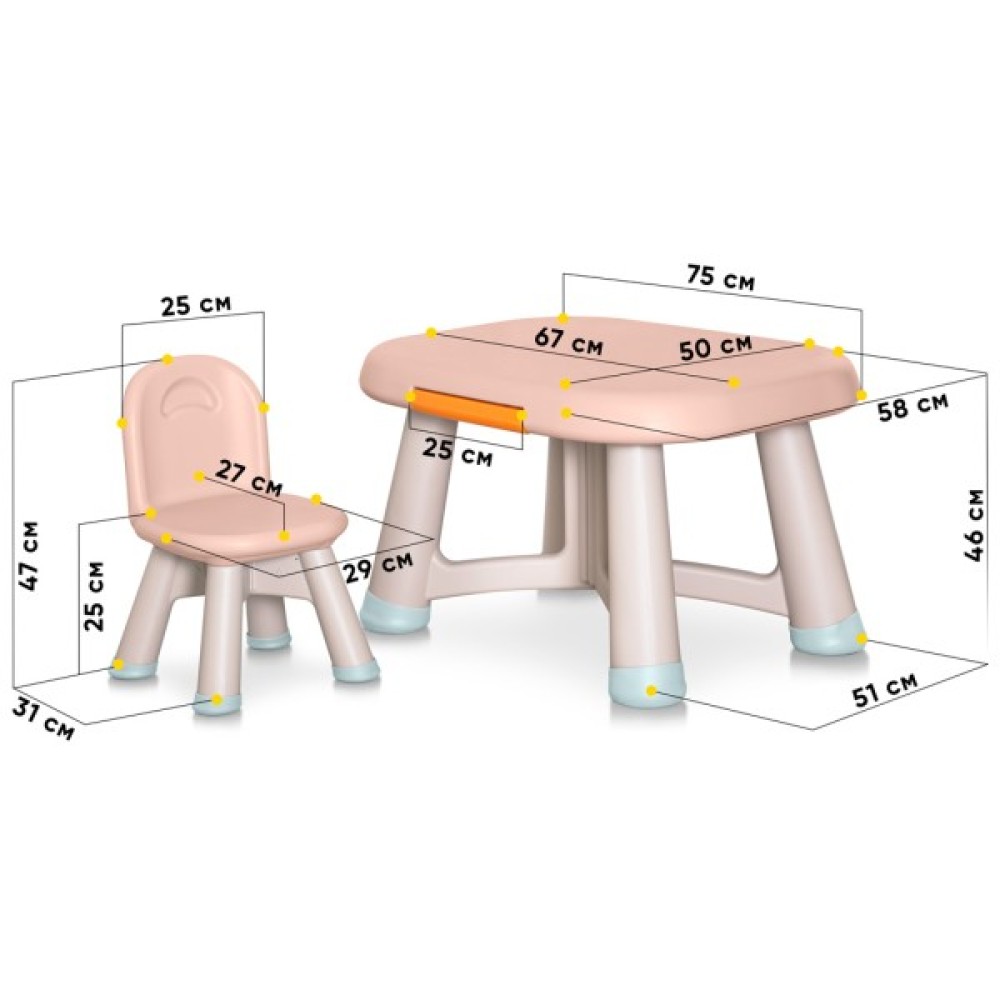 Завдяки заокругленим безпечним кутам та прогумованим накладкам на ніжках столика та стільця, дитина буде захищена від можливих травм, а підлога - від подряпин. Цей комплект ідеально підходить для різноманітних занять: від годування до малювання та ліплення з пластиліну.