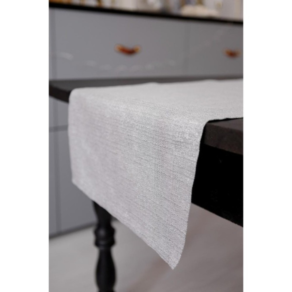Ошатна доріжка прикрасить вітальню або їдальню. Тканина щільна з ниткою люрексу. Забарвлення буде добре гармоніювати зі світлими і чорними тонами меблів в інтер'єрі.