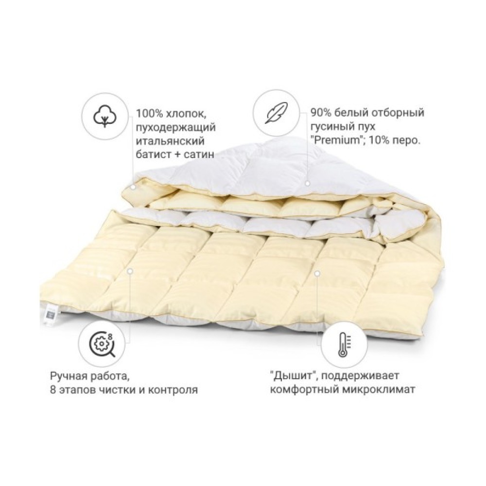 Наповнювач: добірний 100% елітний гусячий білий пух скандинавського гусака Екстра Преміум категорії. Показник Fill Power (показник пружності, ступеня відновлення пуху в ковдрі після стиснення) вагається в межах 700-750 з 800 можливих — один із найвищих і найкращих показників серед пухових наповнювачів.