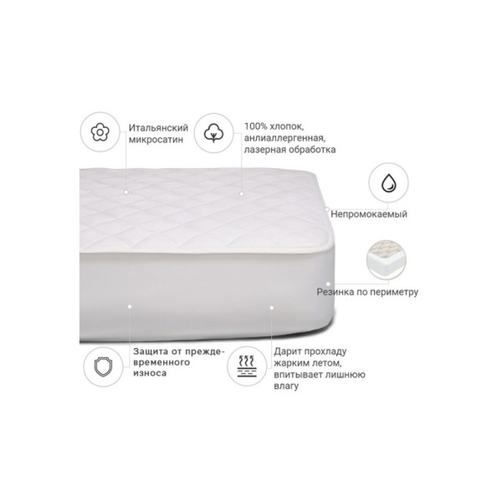 Сам непромокальний наматрацник виготовлений із високоякісної тканини мікросатин — виробництва Італія. Наматрацник витримує понад 250 прань і водночас зберігає свій первісний вигляд. Тканина мікросатин — ніжна, приємна на дотик, сатинове плетіння забезпечує довговічність і м'якість усього виробу загалом. Наматрацник не ковзає по матрацу, добре фіксується.