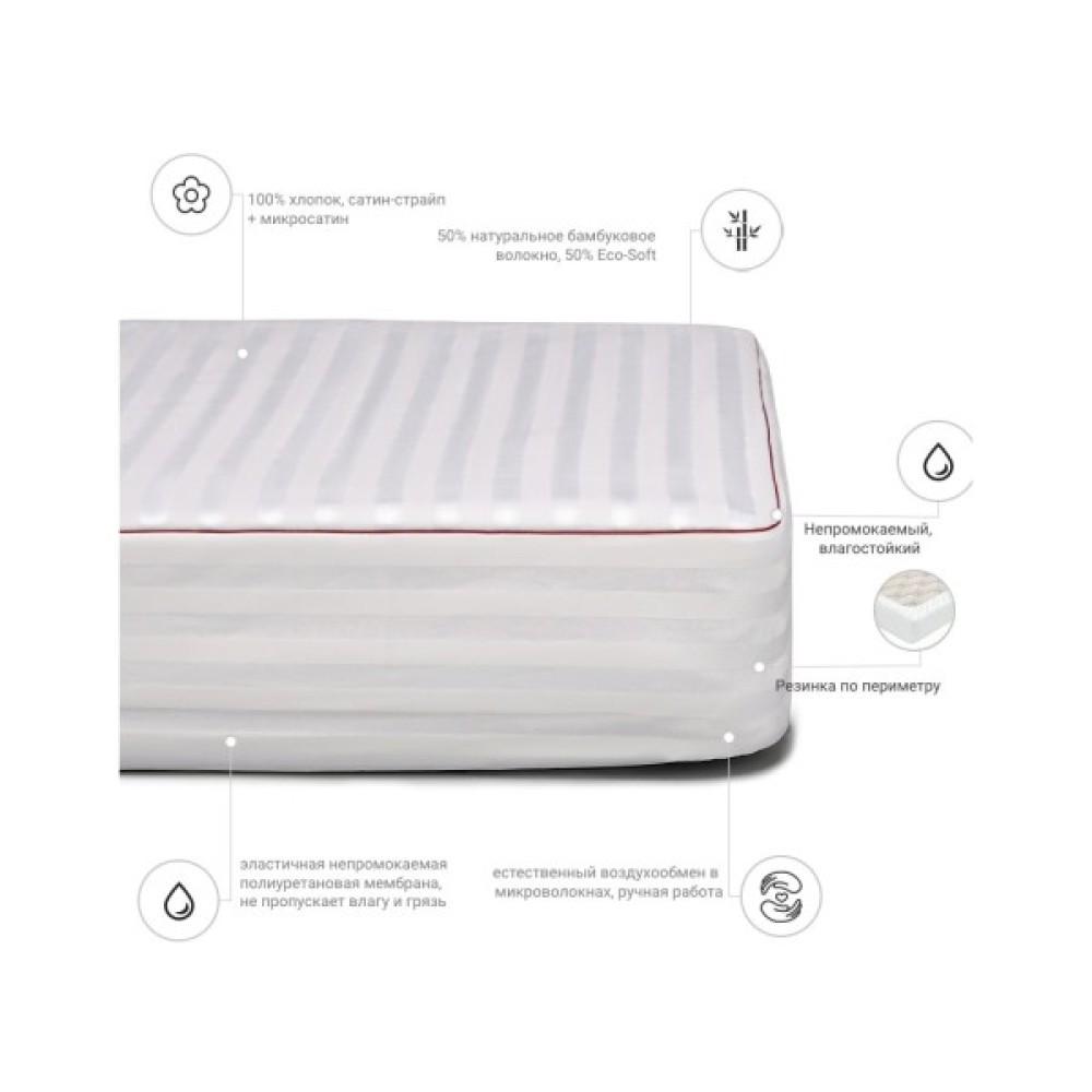 Наматрацник на гумці вздовж периметру з високоякісної італійської тканини класу "DeLuxe". Тканина має назву "Сатин-страйп Італія", яка є довговічною, складається виключно зі 100% високоякісного бавовняного волокна. Сатинова тканина чохла має складне жакардове переплетення, що надає наматрацнику не тільки високоестетичної вишуканість, але й збільшує міцність тканини загалом.